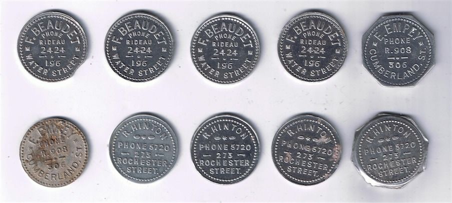 Lot of 11 Ottawa Bottle Return Checks. Includes: Bo 760-BR-S, F. Beaudet 10c, Bo 760-BR-R, F. Beaudet 15c, Bo 760-BR-O, F. Beaudet 30c, Bo 760-BR-I, F. Beaudet 60c, Bo 760-BT-O, E. Empey 30c, Bo 760-BT-T, E. Empey 5c, Bo 760-BV-T, R. Hinton 5c, Bo 760-BV-S, R. Hinton 10c, Bo 760-BV-R, R. Hinton 15, Bo 760-BW-T, R. Hinton 5c. Bo 760-BP-Ex, V. Dumoulin, Good for 5c. VG corrosion to Unc. 10pcs.