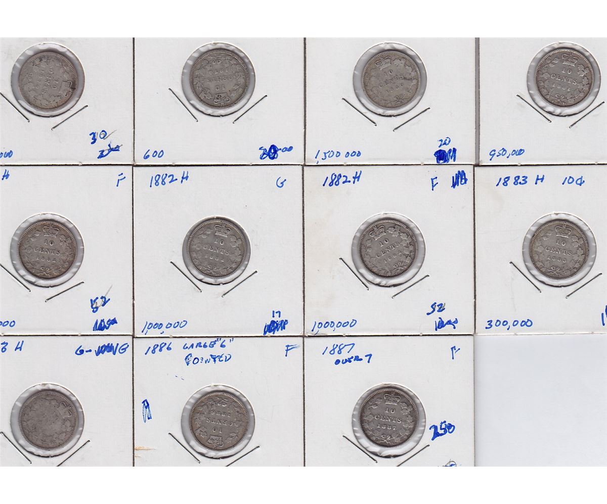 Lot of 11 Ten Cents Includes: 1870 G; 1874H G+; 1880H G; 1881H VG; 1882H G, VG, F; 1883H G, VG; 1886 VG; 1887 VG+. 11 Pcs.