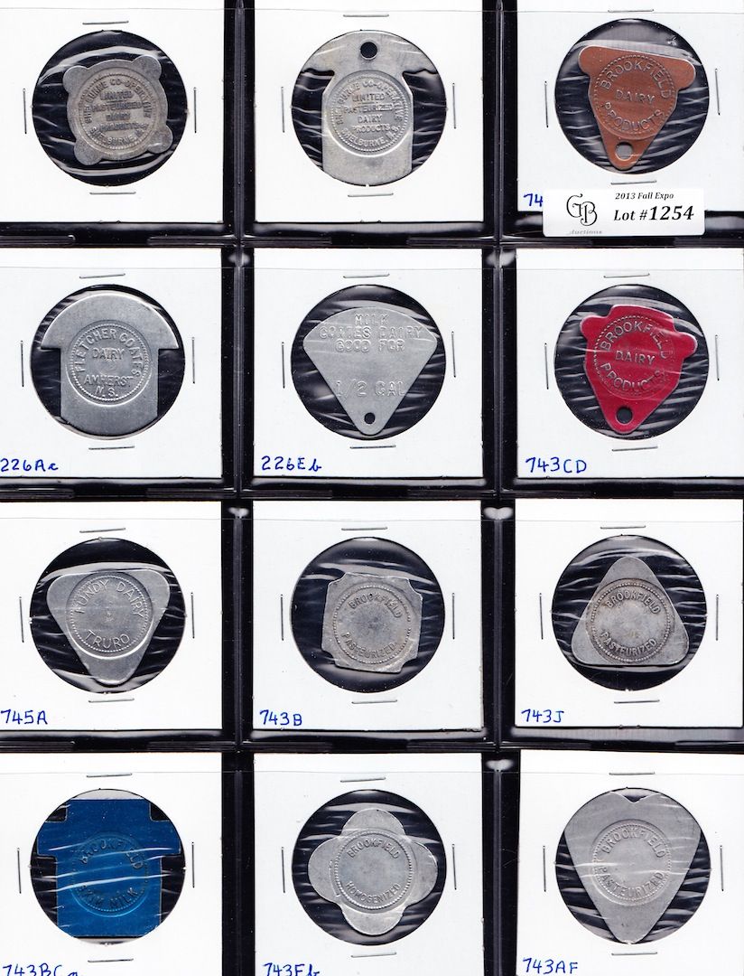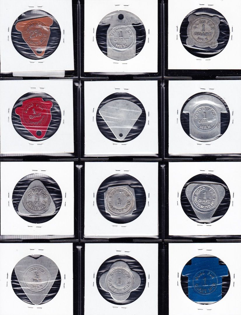 Lot of 12 Nova Scotia Trade Tokens. Includes: Nova Scotia Milk Tokens, Various dairies, obsolete, al or anodized al. 12 Pcs.