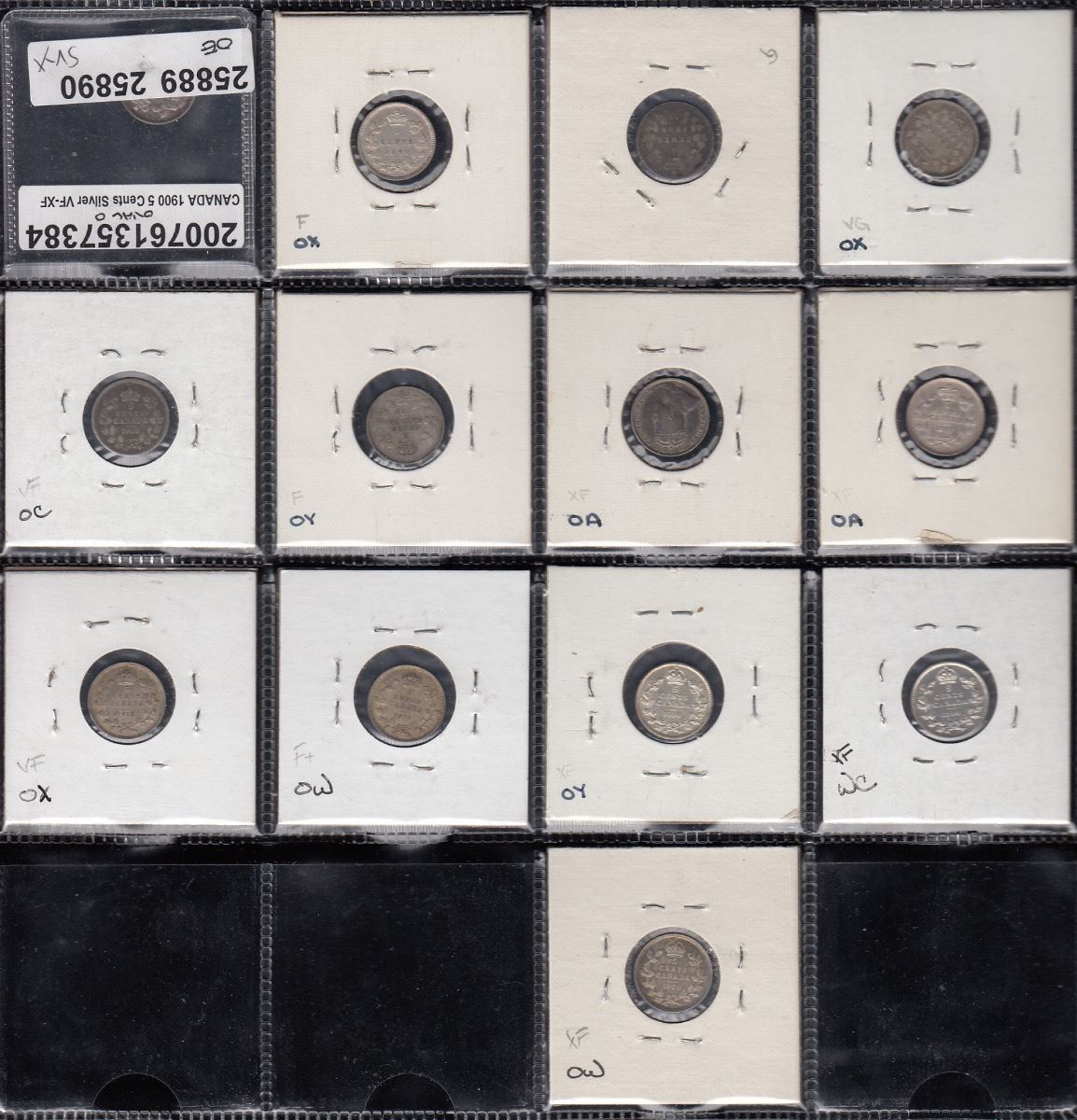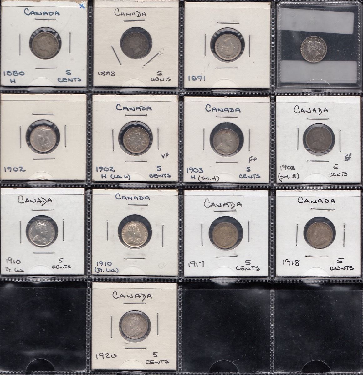 Lot of 13 Five Cents - Includes: 1880H, VG. 1888, G. 1891, VG. 1900, F, damaged. 1902 EF. 1902H, VF. 1903H, F+. 1908, EF. 1910 Pointed leaves, EF, perhaps cleaned. A second 1910 example - VF. 1917, F. 1918, VF. 1920, EF. 13 Pcs.