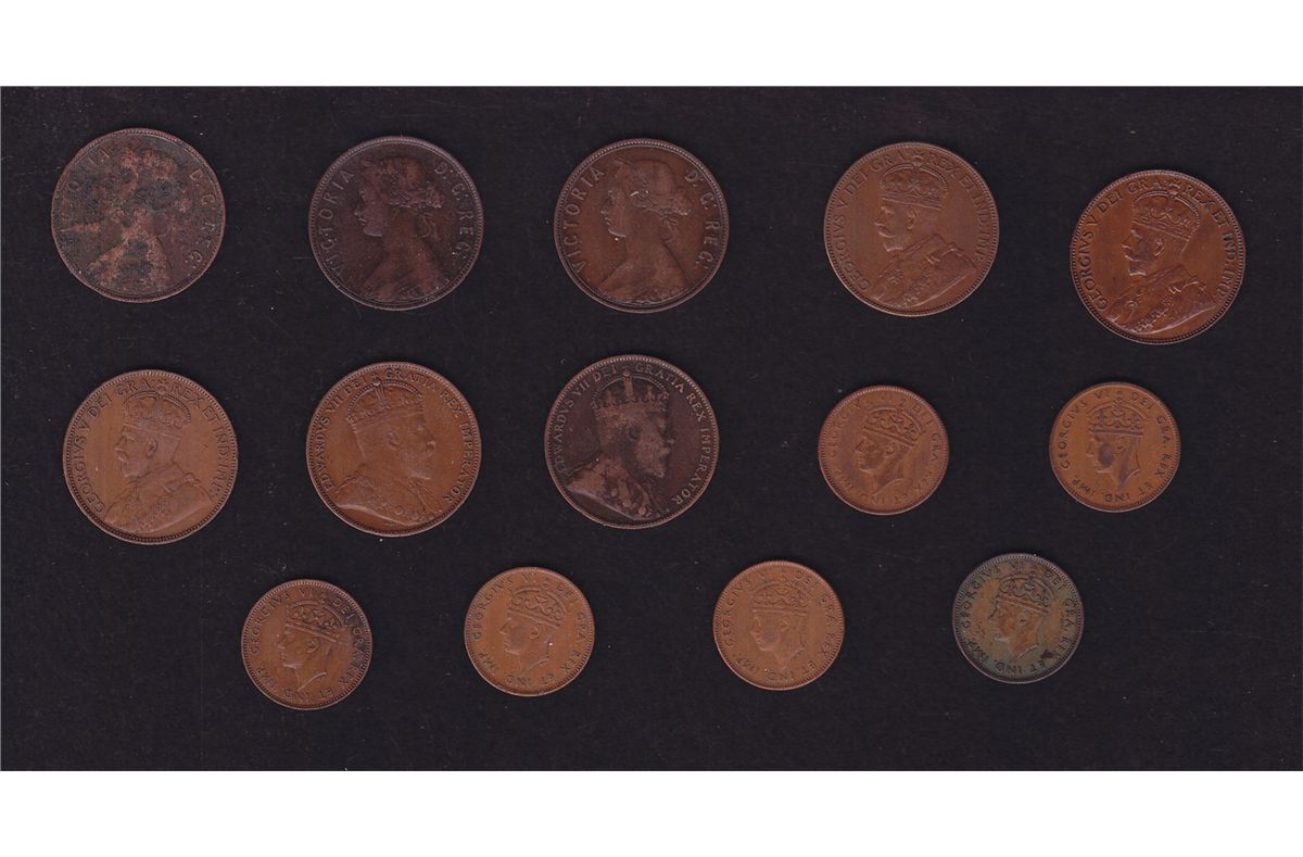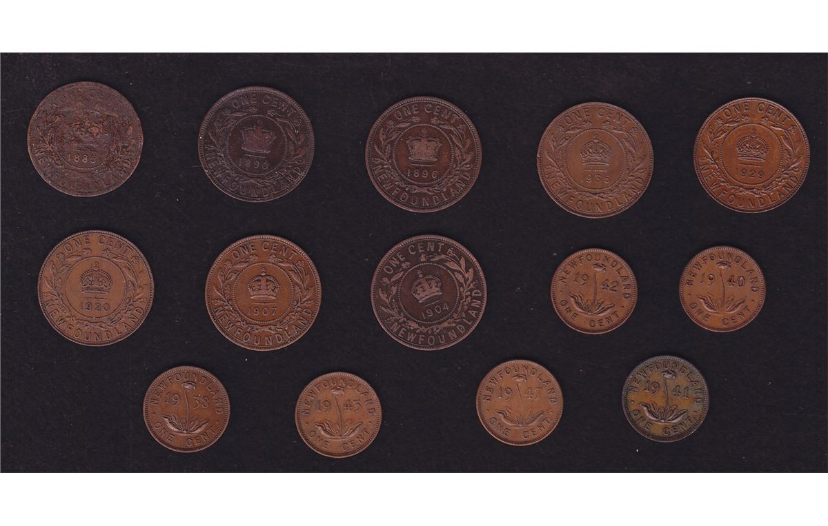 Lot of 14 Newfoundland One Cents - Includes: 1885 damaged; 1890 Fine; 1896 Fine; 1904H VG; 1907 VF; 1920 VF; 1929 EF; 1936 EF; 1938 EF; 1940 EF; 1942 EF; 1943 EF; 1944 Fine; 1947 Fine. 14 Pcs.