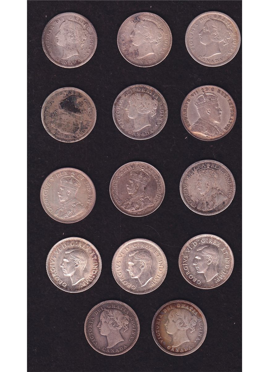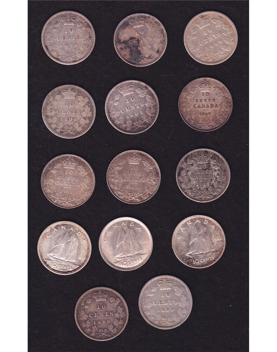 Lot of 14 Ten Cents - Includes: 1874H VG; 1880 Fine, stained; 1888 VG; 1894 AG; 1898 Fine; 1899 Small 99, VG; 1901 Fine; 1910 VF; 1911 VF; 1912 EF; 1915 VG; 1937 BU; 1940 AU; 1943 AU/Unc. 14 pcs.