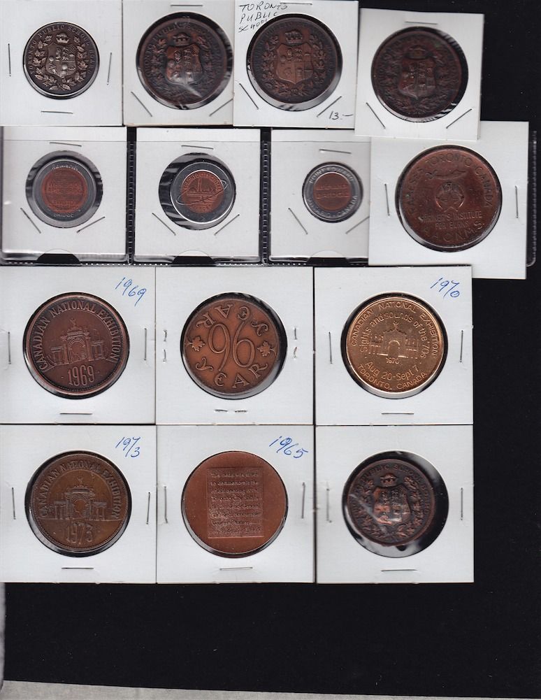 Lot of 14 Toronto Medals & Tokens - Lot of 14 Toronto Medals & Tokens - Includes: CNE medals from 1969,1970,1973,1974. Toronto Shriners, 1965 opening of Toronto City Hall, Five Toronto educational medals (including one silver and four bronze), Three bimetallic transportation tokens. 14 Pcs.