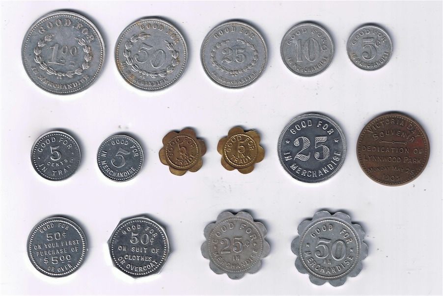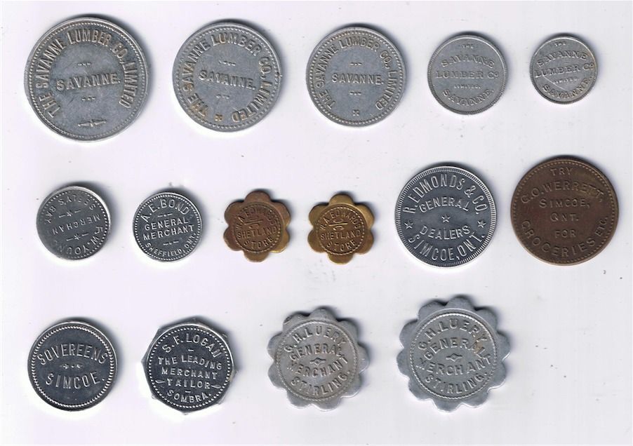 Lot of 15 Ontario due bill tokens. Includes: Five Bo 912-A-A to 912-A-E, The Savanne Lumber Co. Savanne, Ont. Good for $1, 50, 25, 10c, 5c in merchandise. Bo 916-A-E F.W. Young, Seely Bay. Good for 5 cents in trade. Bo 902-A-E, A.E. Bond Sheffield, Ont, Good for 5 in merchandise. Two Bo 932-A-E, W.A. Edward Shetland, Good for 5 in trade. Mc 285, R.Edmonds & Co. Simcoe, Ont., Good for 25 in merchandise. Bo 936-M-G Try G.O. Werrett Simcoe, Ont. Victoria Day 1903. Bo 936-L-B, Sovereens Simcoe, Good for 50c on your first purchase of $5 or over. Mc 749, S.F. Logan Sombra, Good for 50c on suit of clothes. Bo 956-A-C, G.H. Luery Stirling, Good for 25c. Bo 956-A-B, G.H. Luery Stirling, Good for 50c. VF to Unc. 15 Pcs.