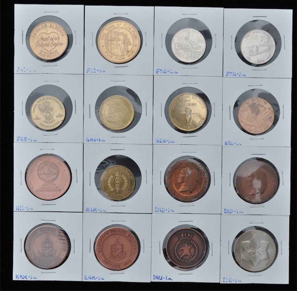 Lot of 16 Centennial Medals - Includes: Kamloops and District coin club (2XKAM-1a) (, Inuvik (INU-1a), Israel Salutes Centennial (ISR-1a), Indian Friendship (2XIND-1a), Humboldt (HUM-1a), Trans-Canada (HIS-1a), Herbert memorial park (HER-1a), Grande Prairie (GRA-1a), Gardiner Dam dedication (GAR-1a), Fredericton (FRE-1a), Fort Saskatchewan (FOR-3a), Fort McMurruy (FOR-2a), Flin Flon (FLI-1a), Fairview, AB (FAI-1a). 16 Pcs.