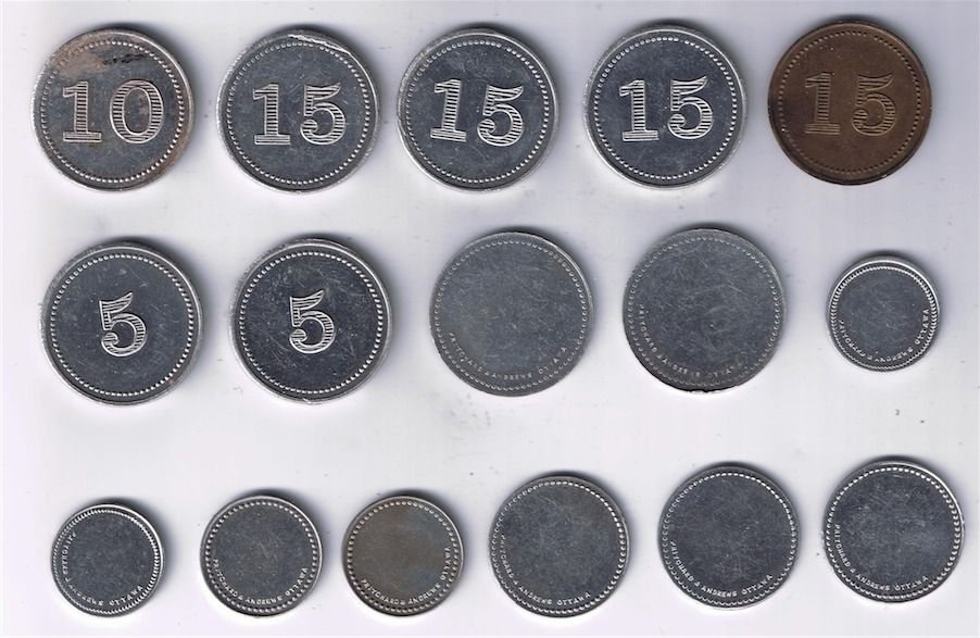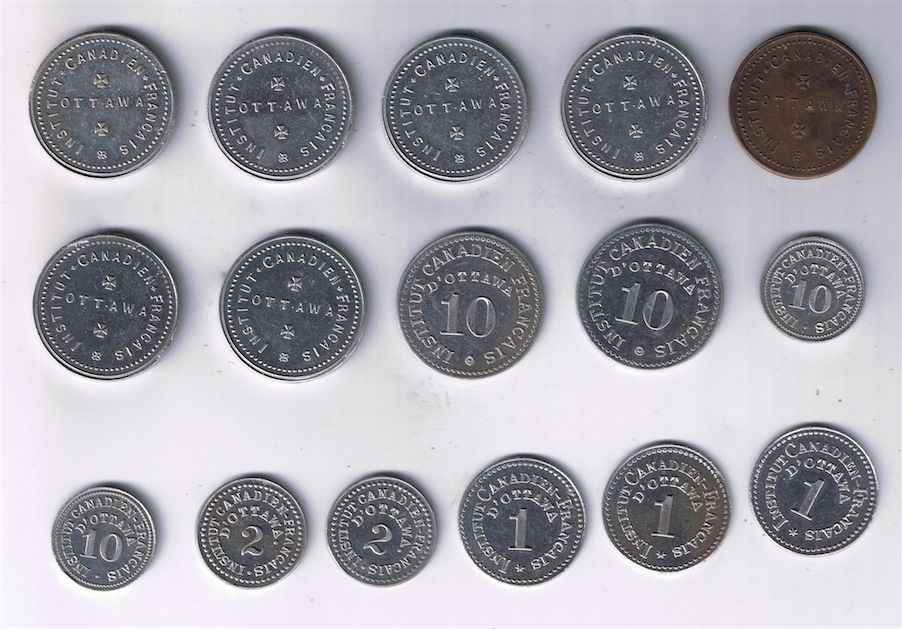 Lot of 16 Institut Canadien Français Ottawa Tokens. Includes: Bo 760-BI-F, 10. Three Bo 760-BI-E, 15. Bo 760BI-Ex, brass, 15. Two Bo 760BI-G, 5. Two 760 BJ-F, 10. Two Bo 760-BJ-Fx, 10. Two Bo 760-BJ-J, 2. Three Bo 760-BJ-K, 1. EF to Unc. 16 Pcs.