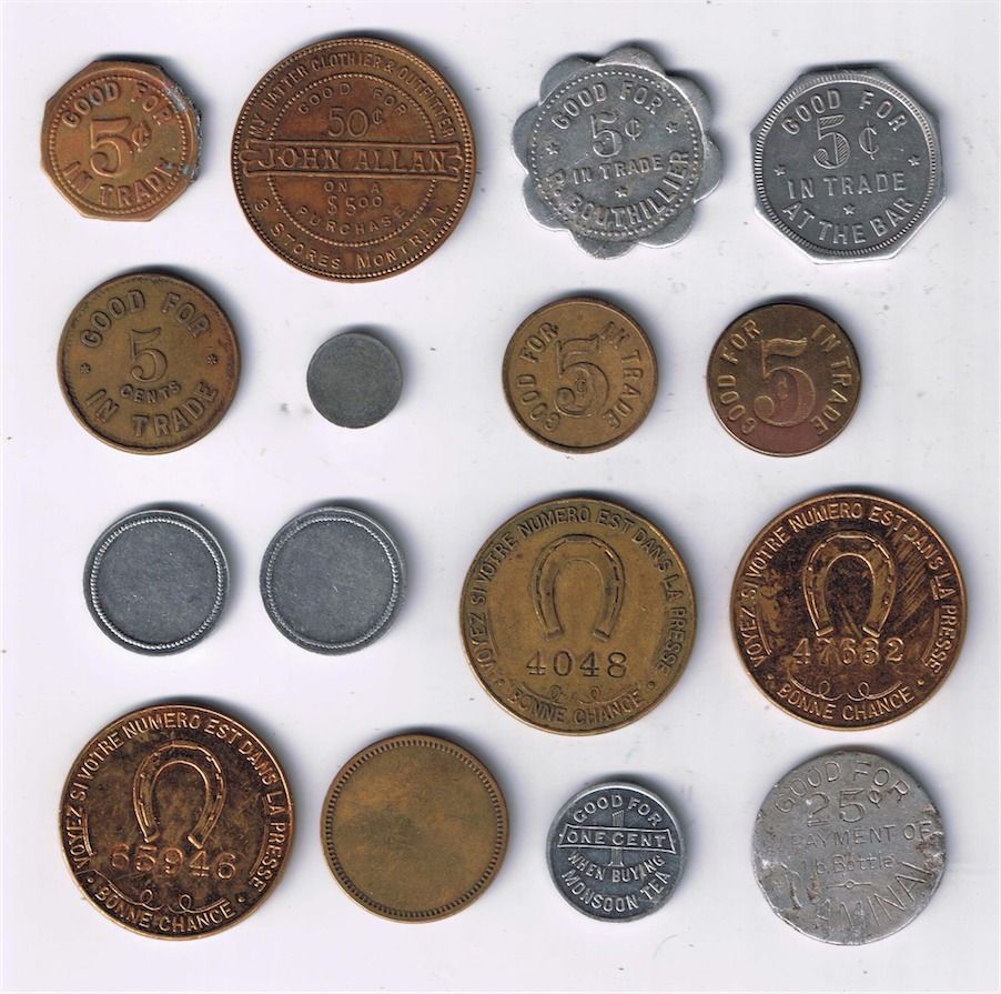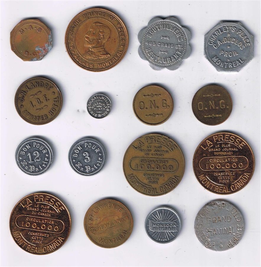 Lot of 16 Quebec trade tokens. Includes: QNC 2822 M.A.S. B.C.I. 5c in trade, QNC 2900b John Allan 5c on a $5 Purchase - bust of Prince of Wales.32mm, QNC 2915a Bouthillier's Restaurant 5c in trade, QNC 2979e Charley's Place 5c in trade, QNC 2991e J.N. Landry Atwater Hotel 5c in trade, QNC 3036a Simpson, Hall, Miller & Co. Uniface, QNC 3110e O.N.G. 5c in trade, QNC 3111e O.N.G 5c in trade incused, QNC 3179a 12 La Patrie uniface, QNC 3179c 3 La Patrie uniface, QNC 3184a La Press 100000 #4046, QNC 3184a La Press 100000 #47632, QNC 3184a La Press 100000 #64946, QNC 3242 Dreamland Uniface, QNC 3333 Monsoon Tea 1c when buying tea, Johnson's Fluid Beef Brand Staminal Good for 25c in Payment of 1lb Bottle Staminal. Aluminum, Round, Incused, 26mm. 16 Pcs.