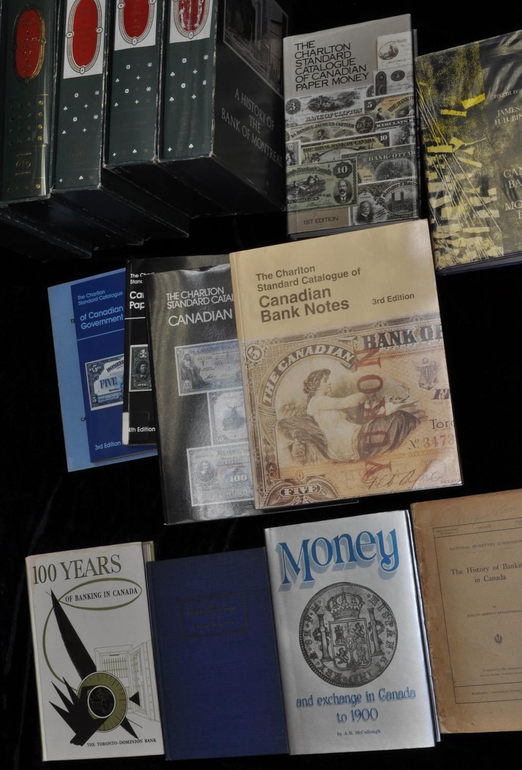 The Charlton Standard Catalogue of Canadian Government Paper Money 1989/91; 1971 Official Terminology Dictionary and Grading Guide; 1980 The Charlton Standard Catalogue of Canadian Paper Money; The History of Banking in Canada 1910; 1965 Canadian Banking & Monetary Policy; 1996 The Charlton Standard Catalogue of Canadian Bank Notes 1989/96/; 1984 Money and Exchange in Canada to 1900; 1946 The First Hundred Years, History of the Montreal City and District Savings Bank; 1958 100 Years of Banking in Canada The Toronto-Dominion Bank; 3 Copies of Canada's First Bank Volume One 1966; 2 Copies of Canada's First Bank Volume Two 1967.*