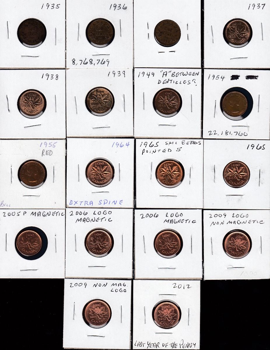 Lot of 18 Canadian One Cents - Dates include: 1935, 2 x 1936, 1937, 1938, 1939, 1949, 1954, 1955, 1964, 2 x 1965, 2005P, 2 x 2006, 2 x 2009, 2012. Conditions vary, decent value, please inspect, no return. 18 Pcs.