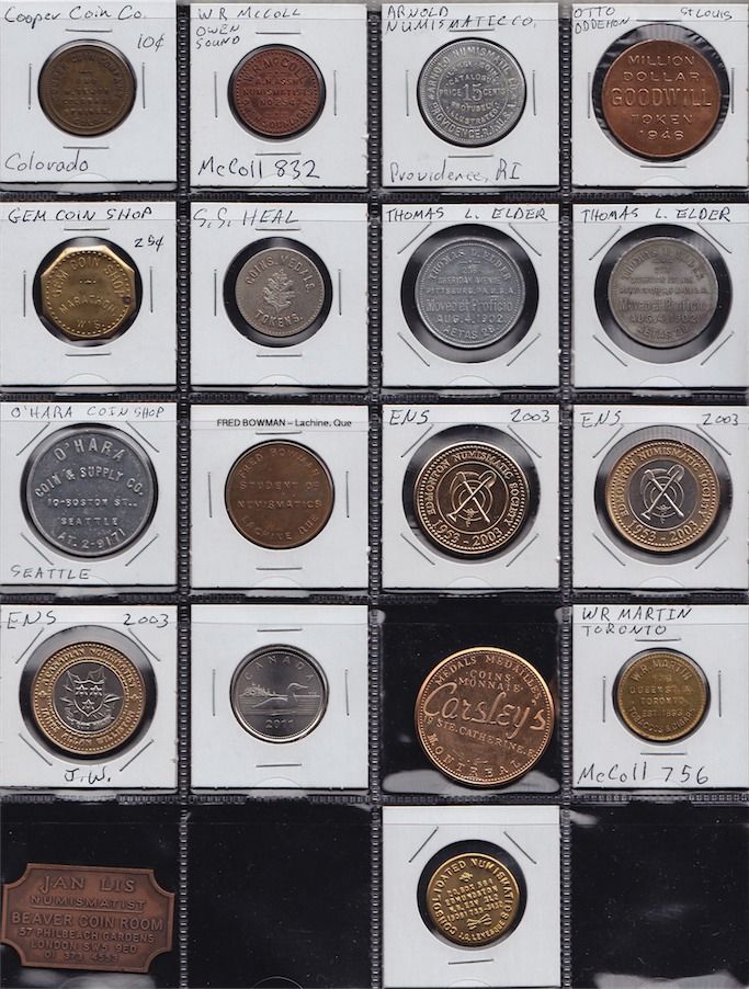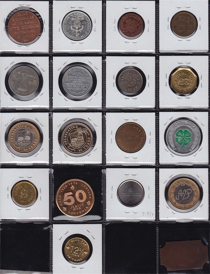 Lot of 18 Numismatist & Coin Shop Tokens. Includes: Cooper Coin Co.; Carsley's; O'Hara; F. Bowman; Elder; Heal; and more. 18 Pcs.