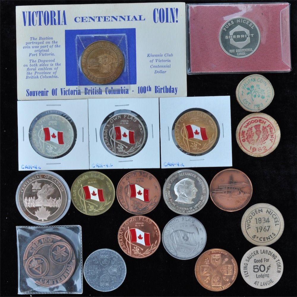 Lot of 19 Centennial Medals, wooden nickels - Includes: Silver plated Sir John A. MacDonald confederation medal. CNE bronze. Atlantic Provinces Pavillion - lead, bronze and brass. Kelsey Medal, nickel, 5,000 minted by the Sherritt Mint. Lester Pearson Prime minister of Canada's Own Flag four medal set in bronze, brass and wm. 19 Pcs.