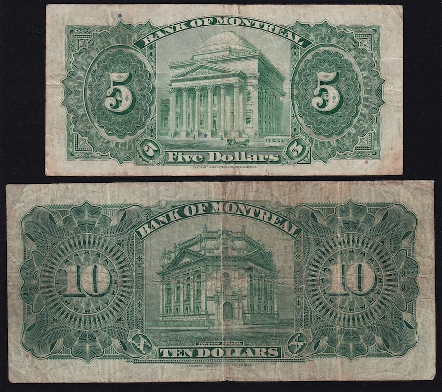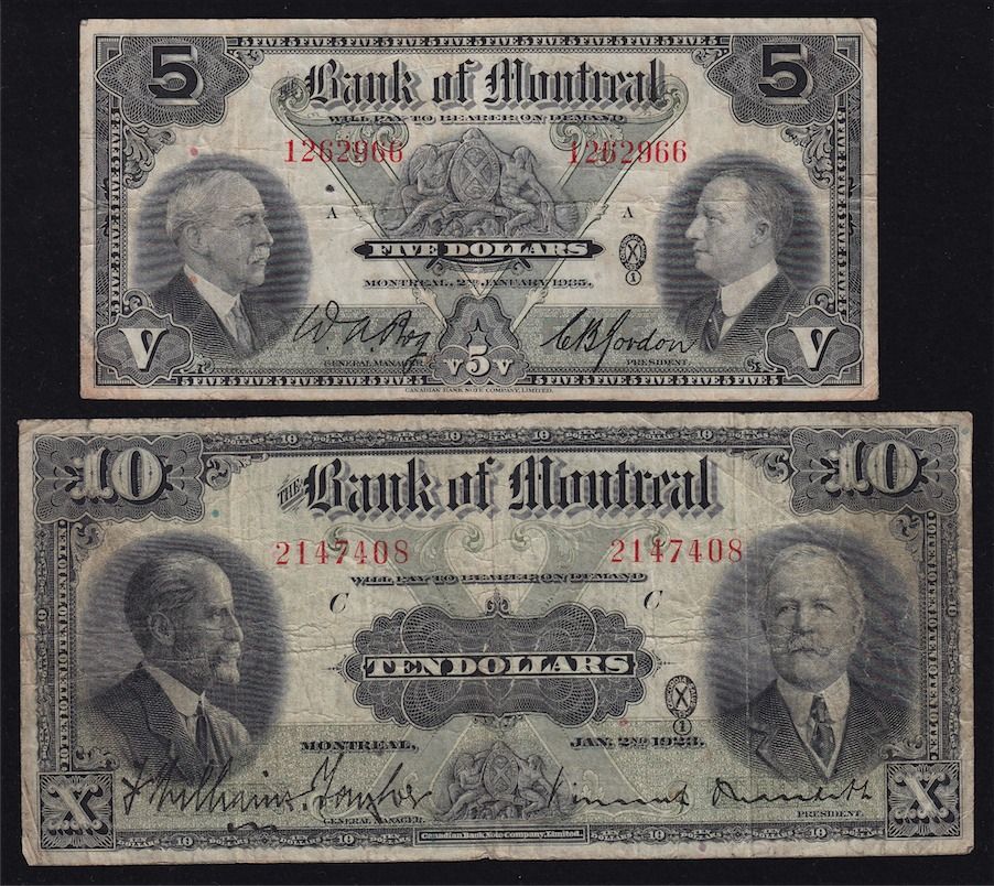 Lot of 2 Bank of Montreal. Includes: CH 505-56-04, Fine, S/N:2147408/C, CH 505-60-02, VF, S/N:1262966/A. 2 Pcs.