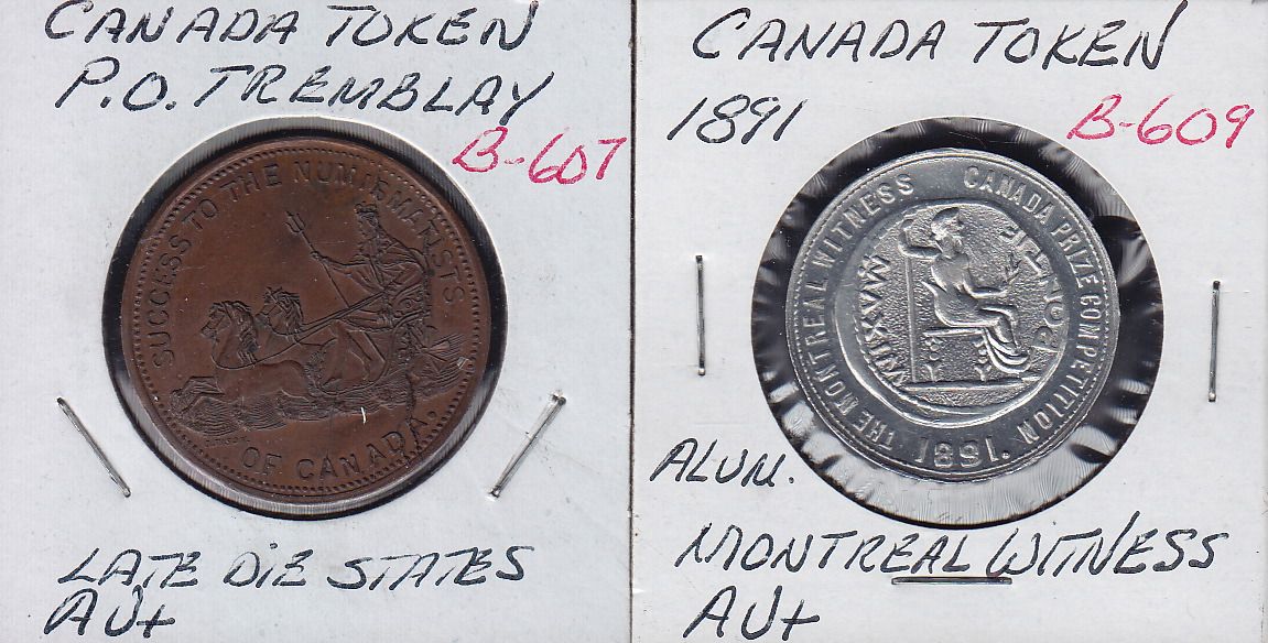Lot of 2 Breton Tokens. Includes: BR 607, P.O. Tremblay, Montreal, PQ, copper, AU; BR 609, Montreal Witness, Montreal, PQ, Aluminum, AU. 2 Pcs.