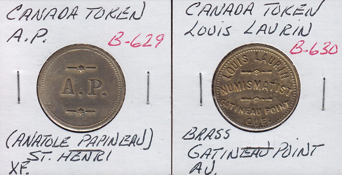 Lot of 2 Breton Tokens. Includes: BR 629, A.P. St. Henri, PQ, brass, EF; BR 630, Louis Laurin, Gatineau Point, PQ, brass, AU. 2 Pcs.