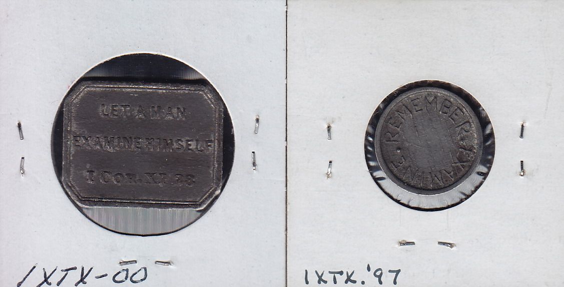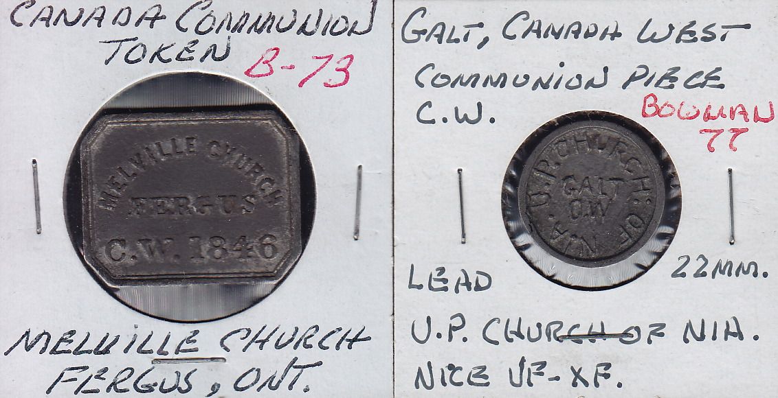 Lot of 2 Communion Tokens. Includes: CH 254-B, Bo 77, Canada West, Galt, VF; CH 248, Bo 73, Melville Church, Fergus, Canada West. 2 Pcs.