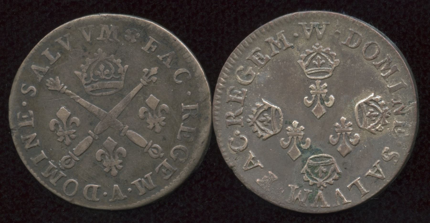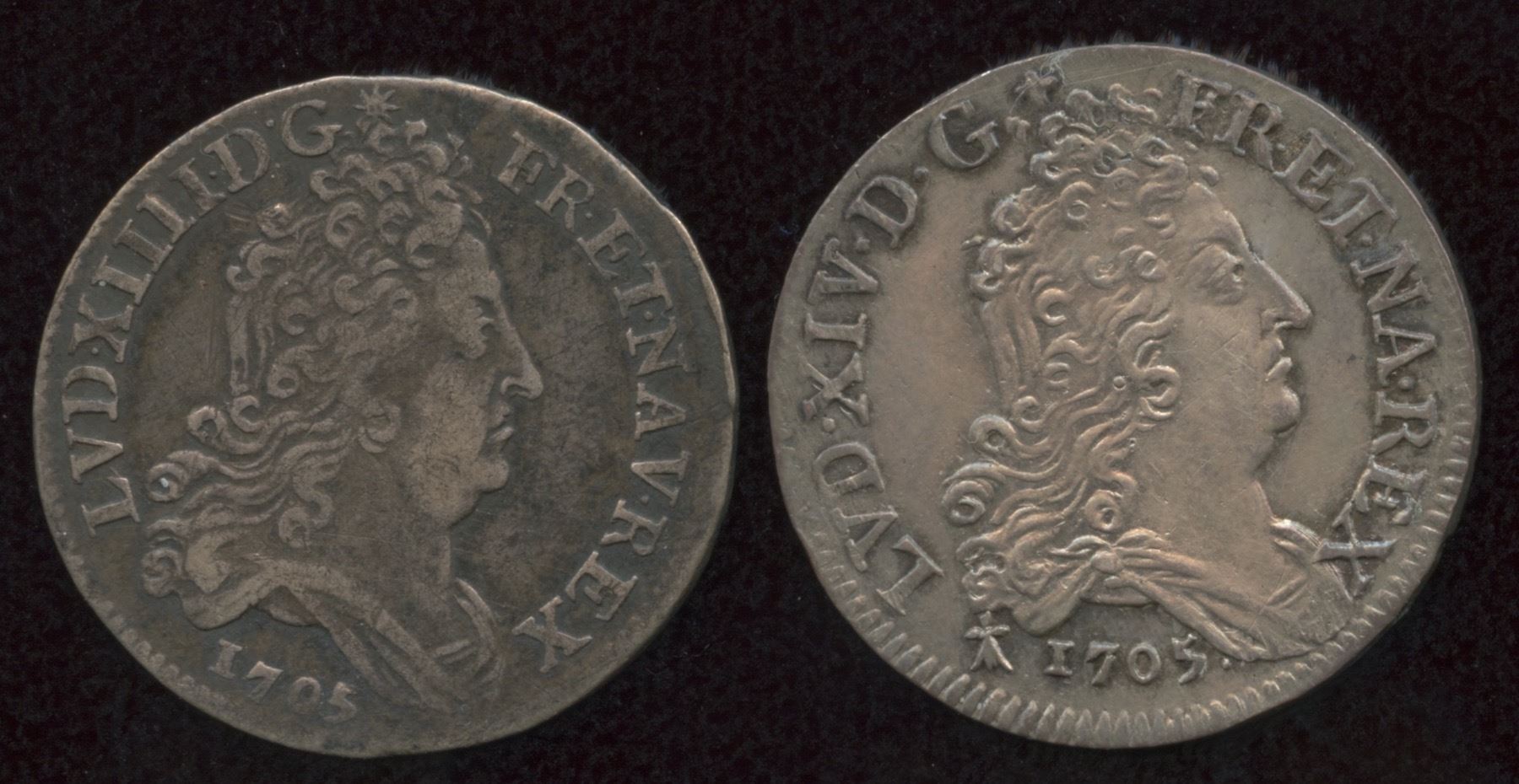 Aux 4 couronnes, 1/8 Ecu, Louis XIV, 1705AA, G & D 132, attractive EF or better with some lustre; Aux insignes, 1/8 Ecu, Louis XIV, 1705A, G & D 133, VF+. 2 Pcs.