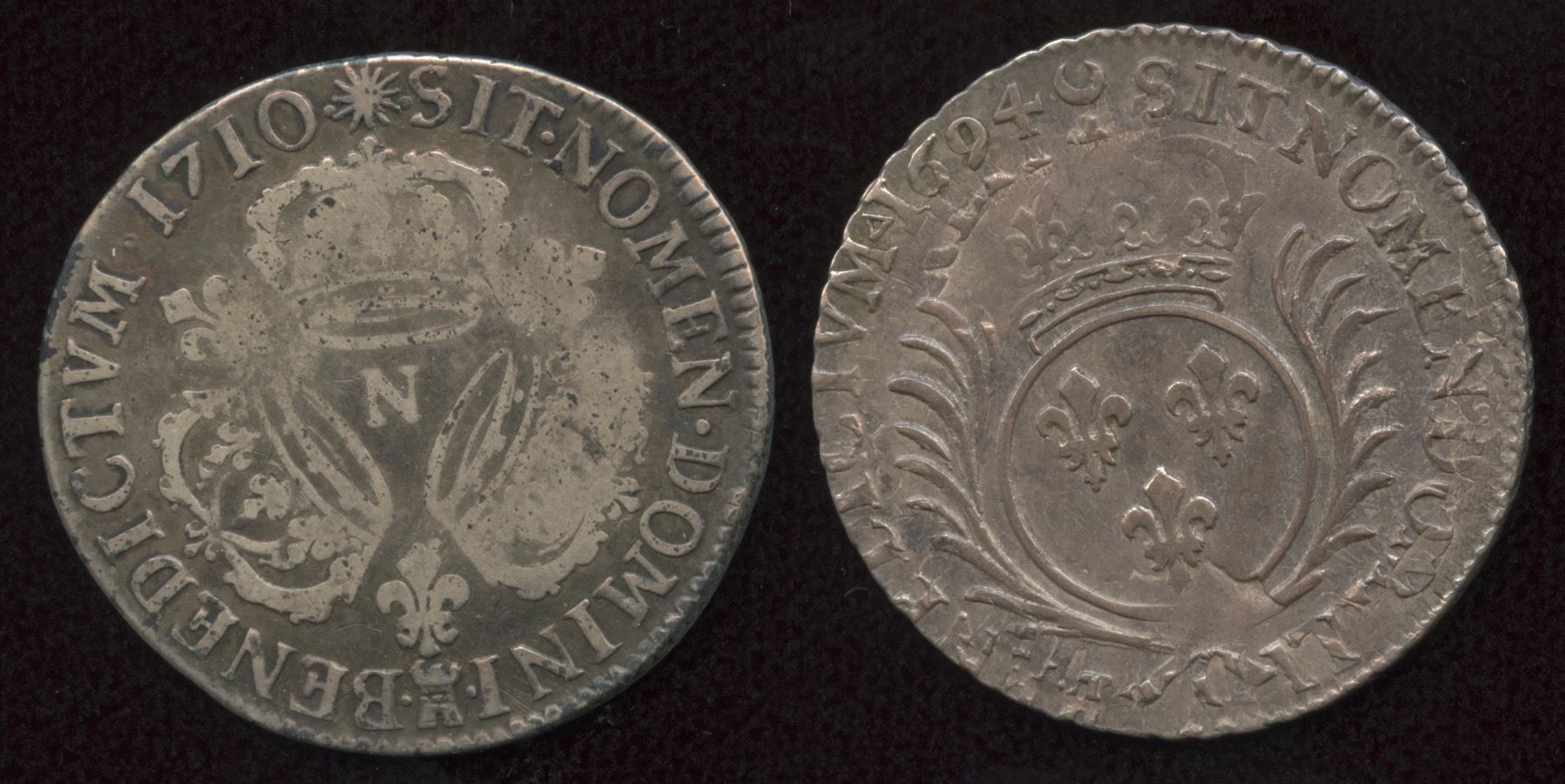 Aux palmes, Louis XIV, 1694A, G & D 152; ¼ Ecu aux trois couronnes, Louis XIV, 1710N, G & D 165. The first VF with much undertype visible, the second VG. 2 Pcs.