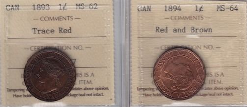 Dates include: 1893 MS-62, Trace Red. 1894 MS-64, Red and Brown. 2 Pcs.