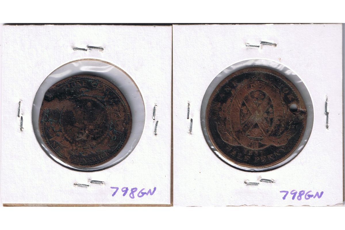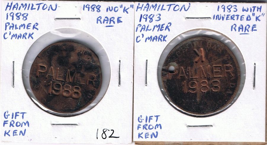 Lot of 2 Ken Palmer Countermarks. Includes: "Palmer 1988" on a New Brunswick One Cent and Inverted "K" "Palmer 1983". 2 Pcs.