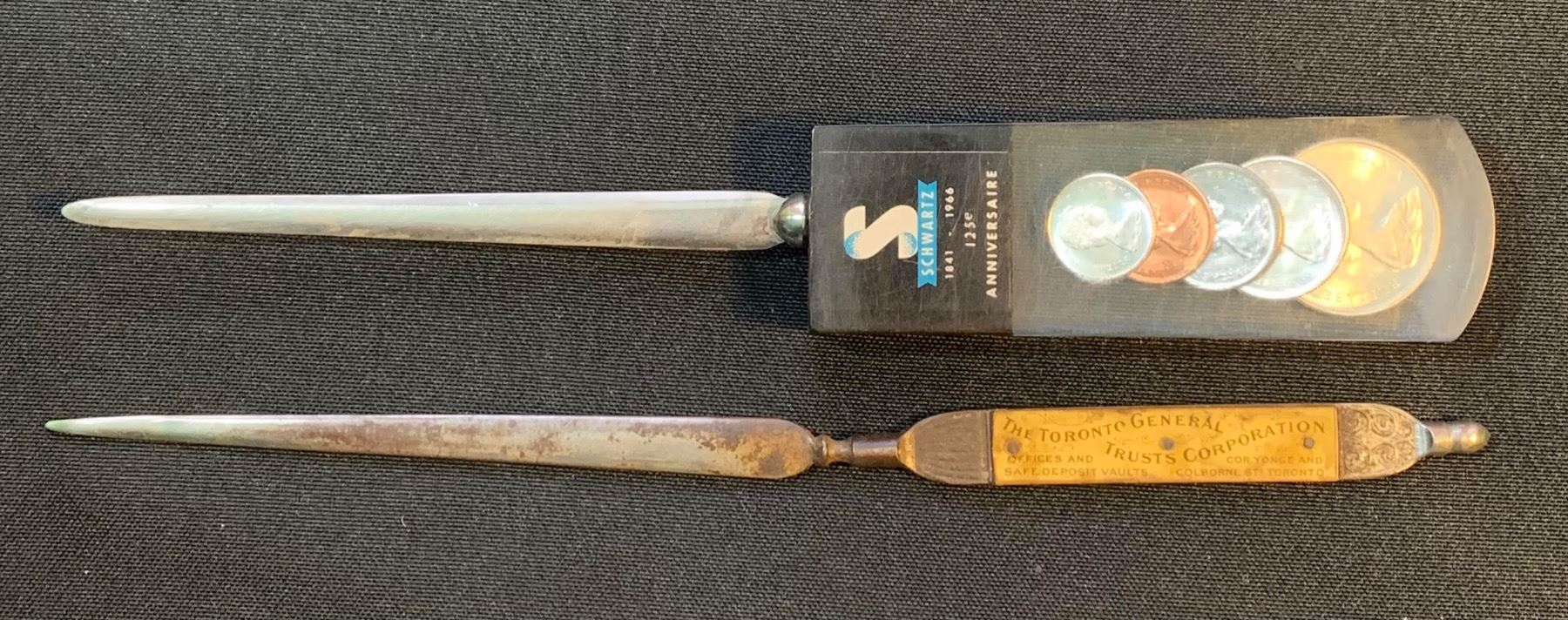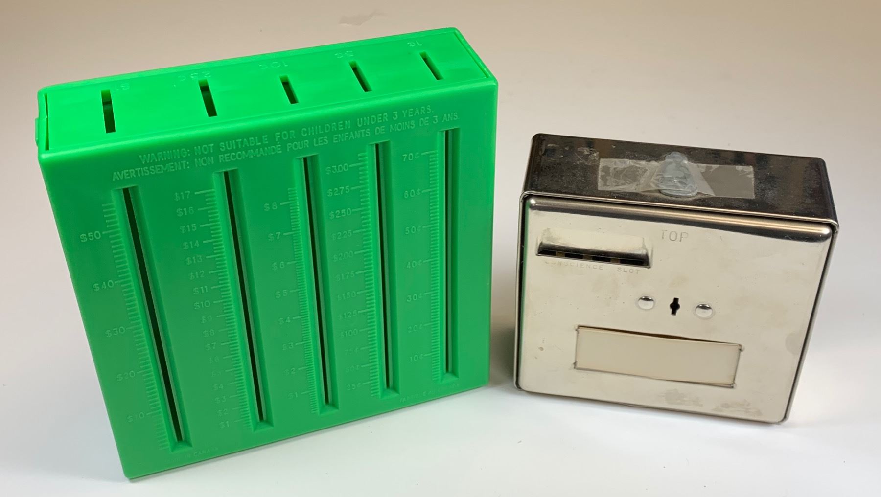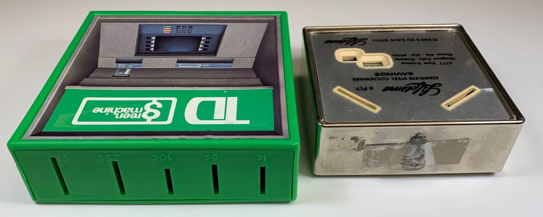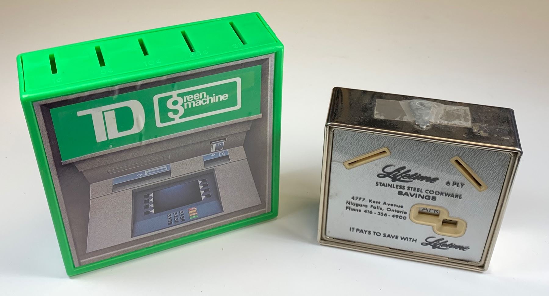 Vintage "The Toronto Trusts Corporation" Office and Sales Vaults & Schwartz 125th Anniversary. TD Bank Green Machine (plastic). Stainless Steel Cookware Savings Bank (Niagara Falls). 4 Pcs.