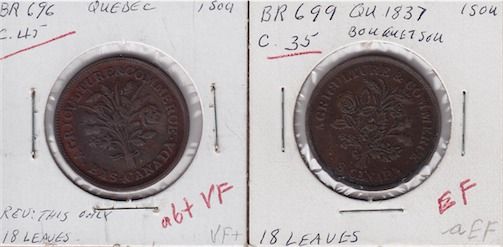 Lot of 2 Lower Canada Tokens - Lot includes: Br 696, CH LC-29B; Br 699, CH LC-30B, EF. 2 Pcs.