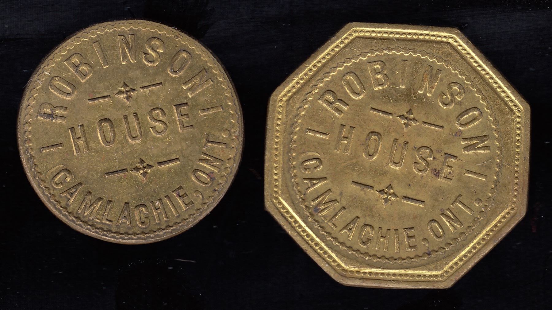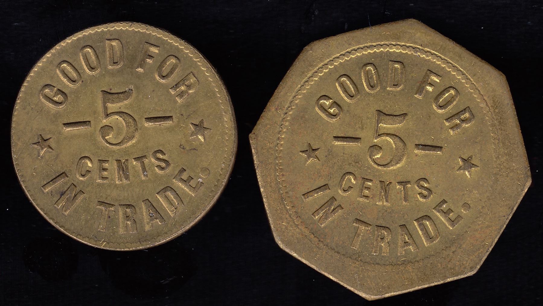 Br. 761a, Robinson House, 5 / Cents / In Trade, brass, BU; Br. 762, Robinson House, 5?, brass, BU. 2 Pcs., the first scarce.