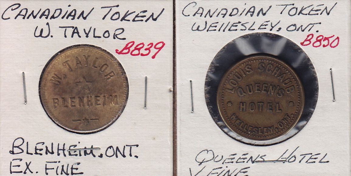 Lot of 2 Post Confederation Tokens. Includes: BR 839, W. Taylor, Blenheim, ON, brass, EF; BR 850, Queens Hotel, Wellesley, ON, brass, VF. 2 Pcs.