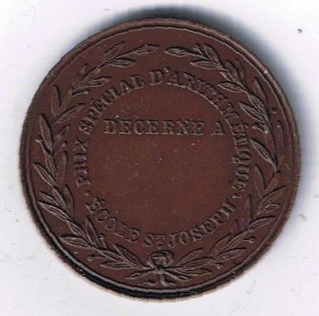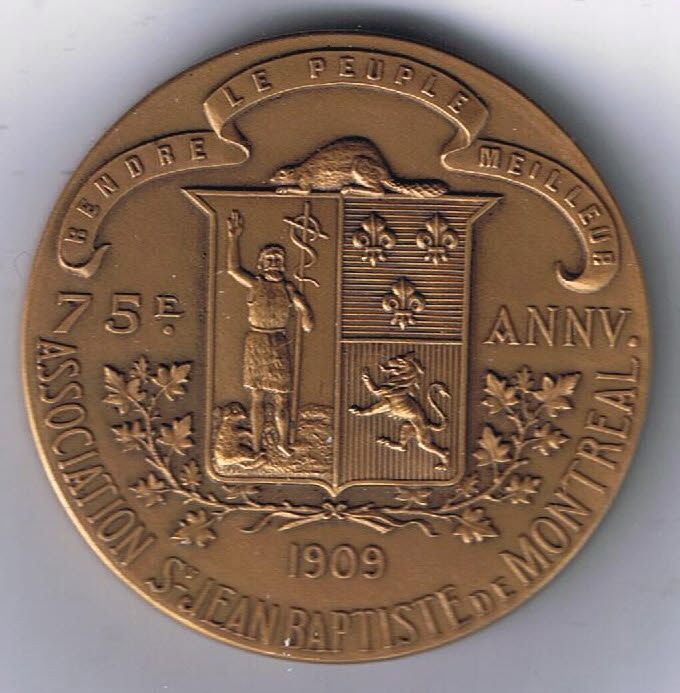 Lot of 2 Tokens. Includes: Copper, Women with shields holding olive branches over a kneeling young scholar Jos. LeRoux Donateur. Ecole St Joseph medalette. 25mm, 5.28g. Ler 1742a Bronze, St. Jean Baptiste Society 75th Anniversary 1909. Lafontaine. 40mm. 2 Pcs.