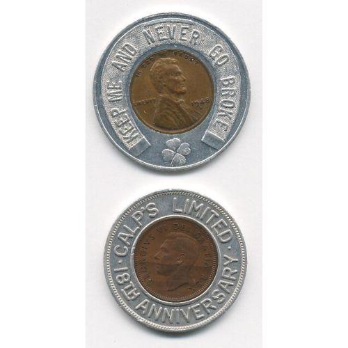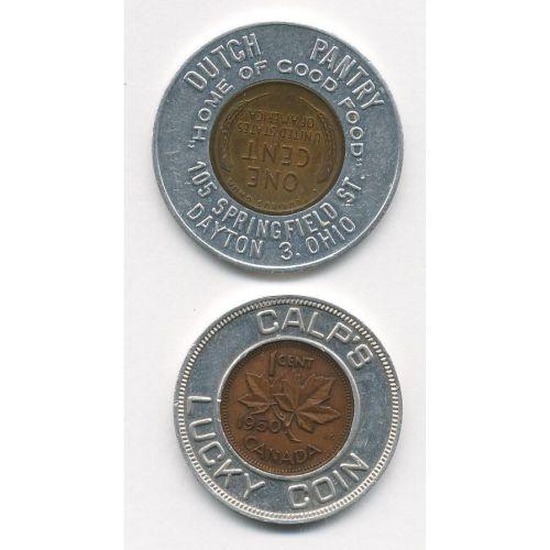 Lot of 2 advertising coins with encasements<BR><BR>1- The one cent in AL outer ring from Calp's Limited in Saint John, New Brunswick, dated 1950. Calp's Lucky Coin commemorates the 18th Anniversary. 2- Keep me and never go broke. The one cent with Al outer ring, Dutch Pantry "Home of Good Food" 105 Springfield St. Dayton 3, Ohio. Coins and encasements EF+