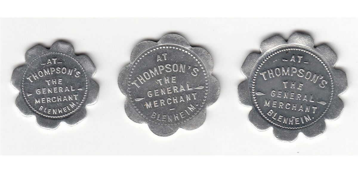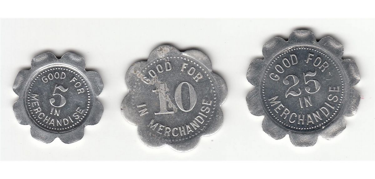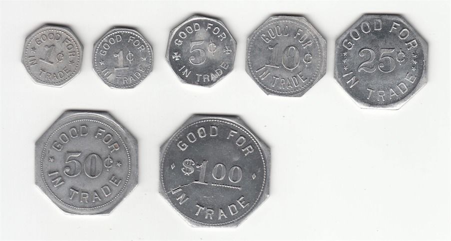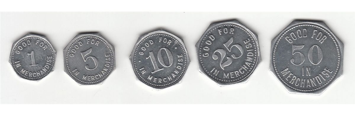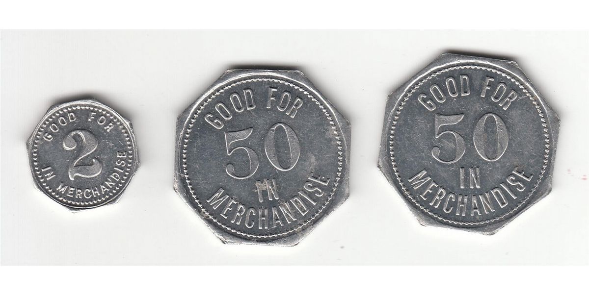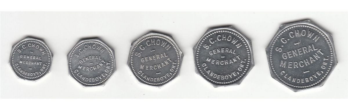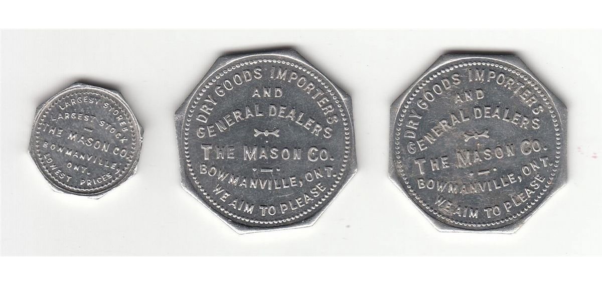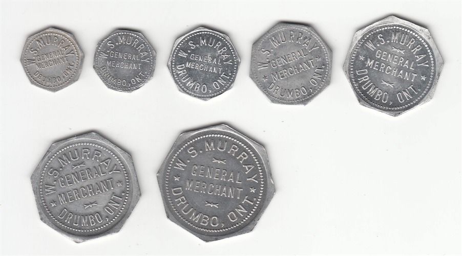 Lot of 20 Due Bill Tokens. Includes: 3 aluminum McColl 352 At Thomson's Blenheim Good for 5, 10 and 25 in merchandise. 3 aluminum McColl 297 The Mason Co. Bowmanville, Ont. Good for 2, 50 and 50 in merchandise. Bo 180-A-F C.W. Keeling Cargill Good for 1c in merchandise. 5 aluminum McColl 356 S.C. Chown Clandeboye, Ont. Good for 1, 5, 10, 25 and 50 in merchandise. Bo 464-W-A P.Smierlies Shine Parlors Market Square. 7 Bo 298-D-A to 298-D-Fx W.S. Murray Drumbo, Ont. Good for $1, 50c, 25c, 10c, 5c, 1c wide spacing and 1c narrow spacing. VF to Unc. 20 Pcs.