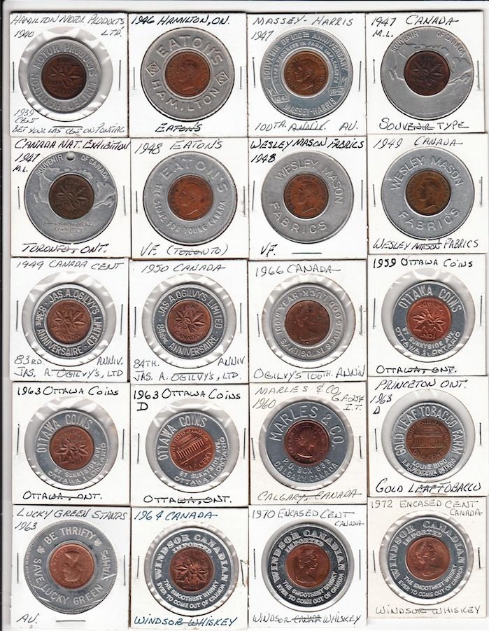 Lot of 20 Encased Coins. Includes: Hamilton Motor Products Limited, Eaton's Hamilton, Massey-Harris, 1c Souvenir of Canada, 1c CNE Toronto, Eaton's, Wesley Mason Fabrics x2, Jas. A. Ogilvy's Limited x3 different, Ottawa Coins x3, Marles & Co., USA 1c Gold Leaf Tobacco Farm, Save Lucky Green Stamps, Windsor Canadian Whiskey x3, VF to UNC. 20 Pcs.