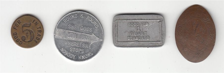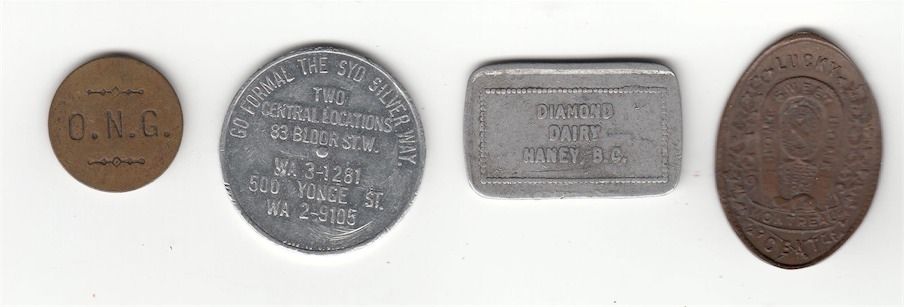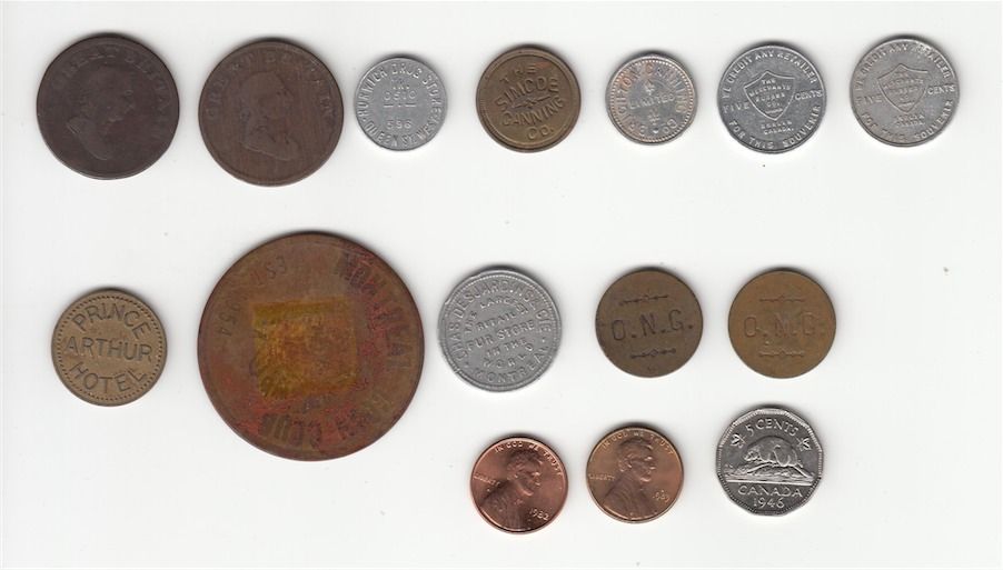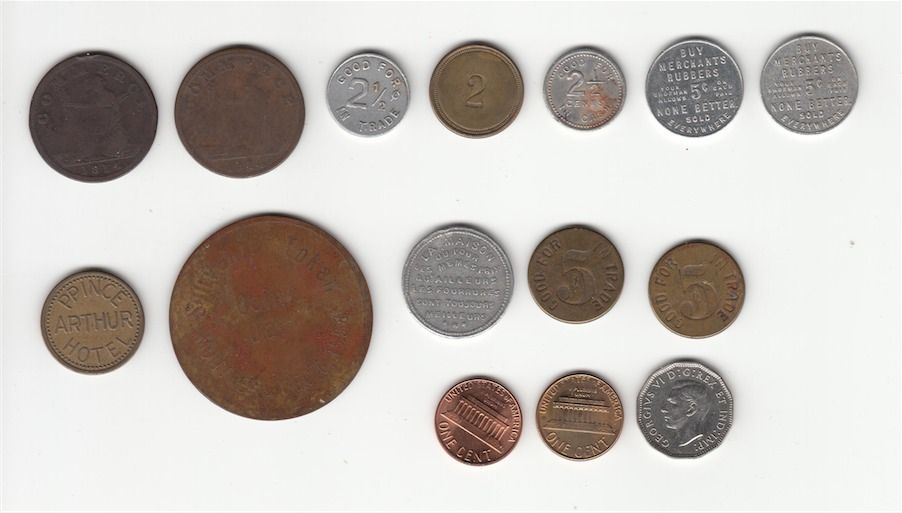 Lot of 20 Misc Coins & Tokens. Includes: Two Bowman-26 Borderline tokens, 1814 half penny Commerce. Bo-1048-T-F, Hurwich Drug Store, Good for 2 1/2c in trade. Mc 1225, The Simcoe Canning Co, 2. Mc 735, Brighton Canning Co. Good for 2 1/2 cents in cash. Two The Merchants Rubber Co. 5c on each pair. Prince Arthur Hotel. Montreal Coin Club, Souvenir Token Coin Day Montreal Dec. 6, 1958. Mc 806a, Chas. DesJardins & Cie. Montreal. Two Bo 3109a, O.N.G., Good for 5c in trade. USA 1982P penny, USA 1983P penny. Canada 1946 5c. Wooden Nickle 1838-1938 World Peace Prescott, Ont. Bo 3109a, O.N.G., Good for 5c in trade. Spinner Go Formal the Syd Silver Way, 500 Yonge St. H1410e, Diamond Dairy Haney, BC Good for 1 Quart Standard. Home Sweet Home Montreal on an elongated 1909 Canadian Large Cent. G to EF. 20 Pcs.
