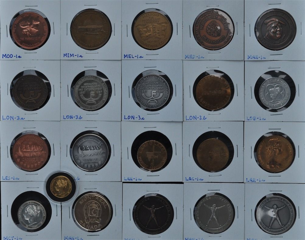 Lot of 21 Centennial Medals - Includes: The Big Penny (LAR-1), Lac La Biche (LAC-1a), Land O'Lakes (LAN-1a), Les Voyages (LES-1a & 1b), Man and his world (set of 3 - cat#Man 1a, b, c) MAN-2a, MTC-1a & MTC1b, LOB-1a, London (LON-2b), Western Fair Association (set of three LON-3a, 3b, 3c), MAR-1a, Medicine Hat Alberta (MED-1a), Melfort (MEL-1a), Mimico Library (MIM-1a), Moose Jaw Coin Club (MOO-1a). 21 Pcs.