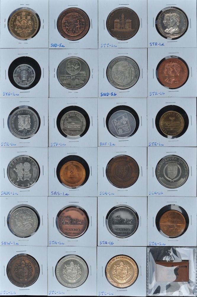 Lot of 24 Centennial Medals - Vancouver Island & British Columbia (SAM-1a), Saint John Wooden Nickel, Saskatoon (SAS-1a), 5th Saskatchewan Scouting Jamboree (BUF-2a), Scarborough Set of two (SCA-1a,b), Purchase of Alaska (SEW-1a), Stanstead Historical Society Set of two (STA-1a, b), Stavely (STA-2a), St. Catherines Set of three (STC-1c, 2a, 2b), Stettler Olympic Swimming Pool (STE-1a), St. Paul Alberta Flying Saucer Landing (STP-1a), St-Raymond - Portneuf (STR-1a), Victoria/Elizabeth Streetsville Set of two (STR-1b,d), St. Thomas Collegiate Institute (STT-1a), 4 different Sudbury ( includes: SUD 4a, 5a, 5b, other), J.W. StepHens Good for 50 cent - Sydney NS (SYD-2a). 24 Pcs.