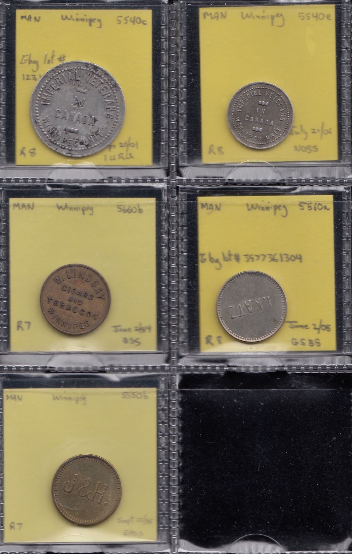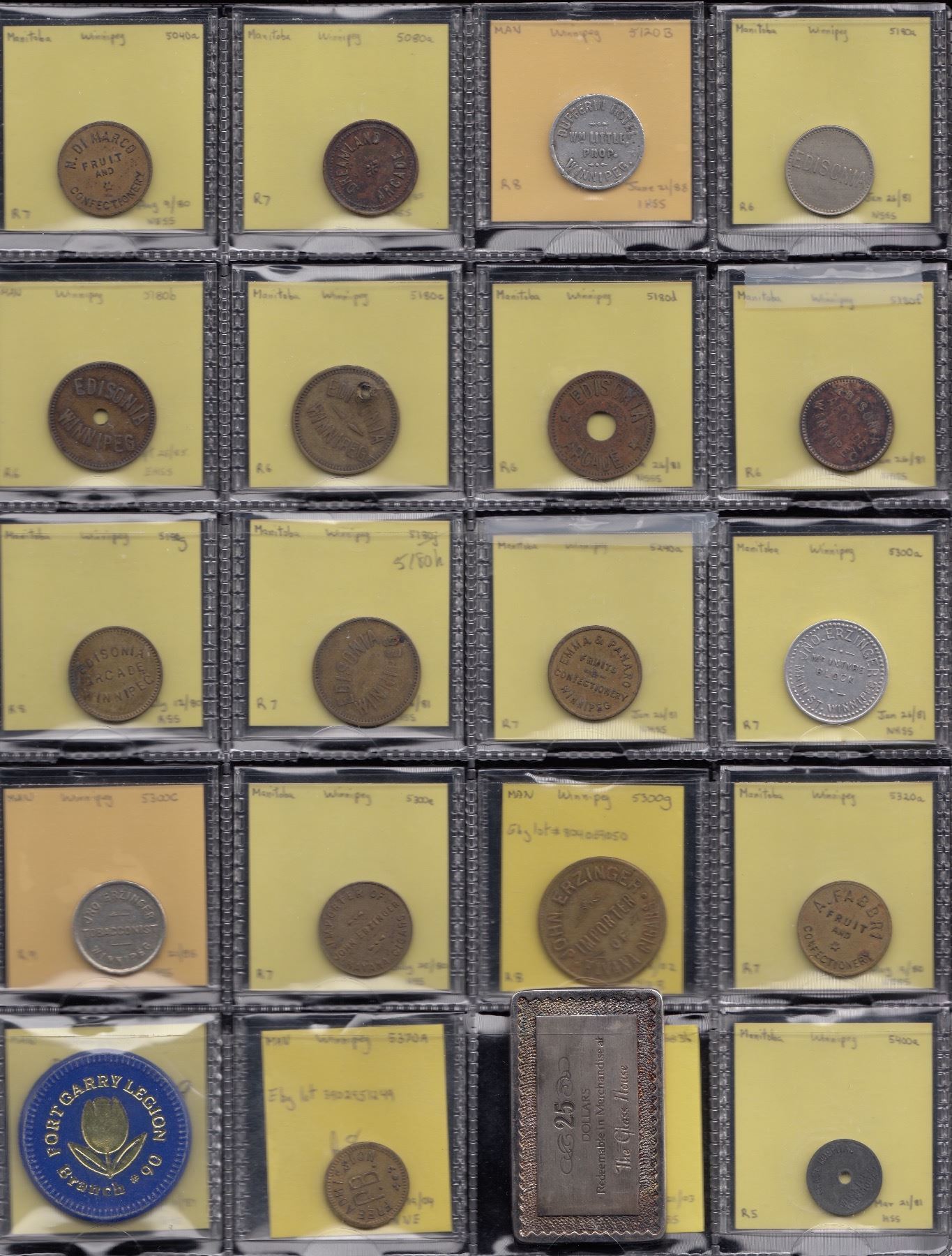 Di Marco 5040a (McColl 203); Dreamland 5080a; Dufferin Hotel 5120b; Edisonia 5180a, b, c (small top hole), d, f, g, h; Emma & Panaro 5240a (McColl 220); Jno. Erzinger 5300a, c (R8), e (McColl 215?), g (R8); A. Fabbri 5320a (McColl 207); Fort Garry Legion drink token, Plb-R-39, UNLISTED. Looks modern and may still be in use, so no rarity rating given. Will be recorded by Mr.Astwood as #5355a; P.B. Free Admit. 5370a (R8); The Glass House 5383b; Grace Hospital 5400a; Imperial Veterans 5540c, e (both R8); J&H 5550b (R8); I. Katz 5560a (R8); W. Lindsay 5660b. Fine - EF. 25 Pcs.