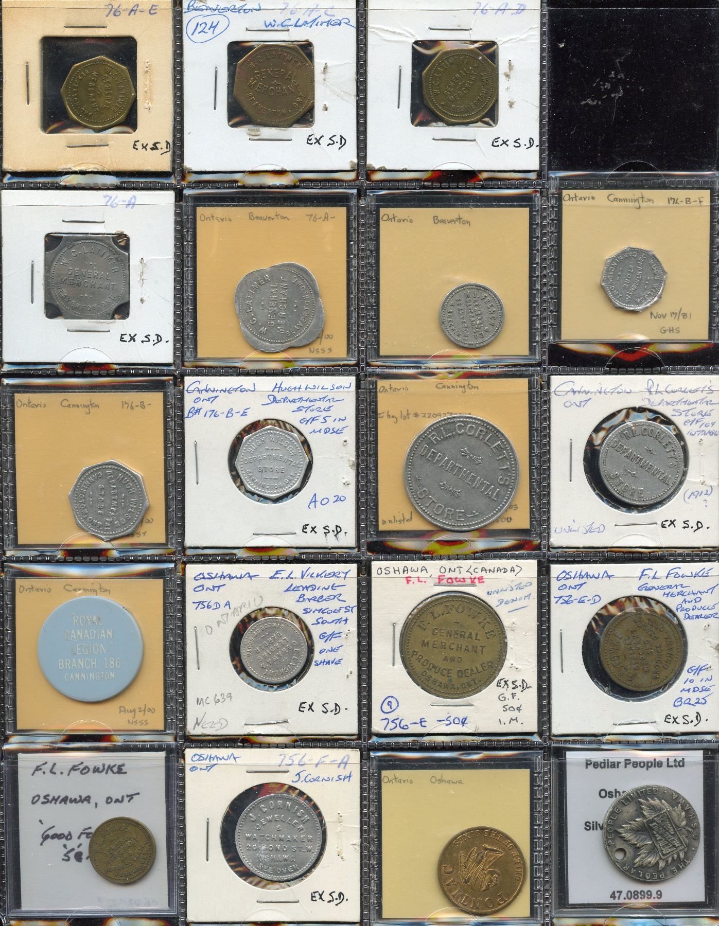 Includes: Bo 76-A-C to A-E W.C. Latimer Beaverton Rev: 25c, 10 cents and 5c; as previous Rev: 3c and 2c in 1982 suppl; W.J. French Beaverton Rev: 1c in 1982 suppl; Bo 176-B-F Hugh Wilson Cannington Rev: 1c; as previous Rev: 10 and 5; R.L. Corlett's (Cannington) Rev: $1 unlisted and 10c; Legion Branch 186 Cannington; E.L. Vickery Oshawa Rev: one shave; F.L. Fowke Oshawa Rev: 50, 10 and 5; Bo 756-F-A J. Cornish Ottawa Rev: one dollar; Pontiac Chief of the Sixes; Pedlar People ltd; As 1405a Monney's (Pickering) 1 loaf; Bo 820-A-F Jones Port Perry Rev: 1c; Bo 1072-A-A to A-E J.F. Brownscombe Uxbridge Rev: 1.oo, 50, 25, 10 and 5. F to EF. 26 Pcs.