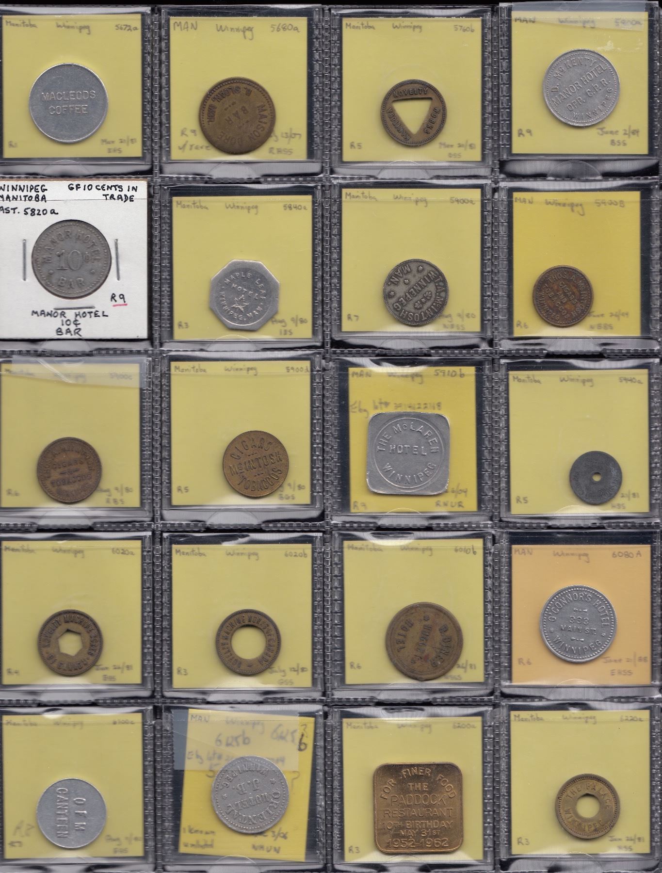 Macleods Coffee 5672a; Maison Dore/Sloan 5680a (R9); Manitoba Novelty 5760b; D. McKenty 5800a (R8); Manor Hotel 5820a (R9); Maple Leaf Hotel 5840a; T.A. McIntosh 5900a (McColl 226); Thos. A. McIntosh 5900b, c (McColl 228?); McIntosh Cigars/Tobaccos 5900d (McColl 227); The McLaren Hotel 5910b (R9); Misericordia Hospital 5940a; Novelty Machine Works 6020a, b; R. Diner/Nugget Hotel 6060b; O’Connor’s Hotel 6080a; OMF Canteen 6100c (R8); Oriental Hotel A-R-19, g/f 5c. R10, UNLISTED, will be recorded by Mr. Astwood as #6125b. Paddock Restaurant 6200a; The Palace 6220a; Pelissier’s Ltd. 6240a (R8); Pillow Radio 6260a; Perky’s 6270a (plastic); Regency Coin 6340a, b (2); Riverview Café 6400d (R8 stain). Fine-EF. 27 Pcs.