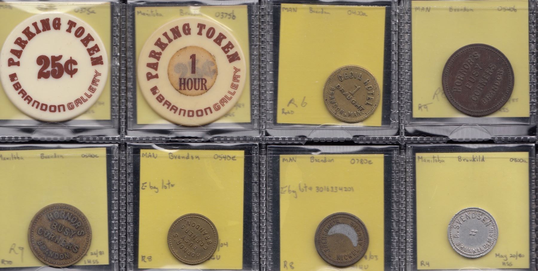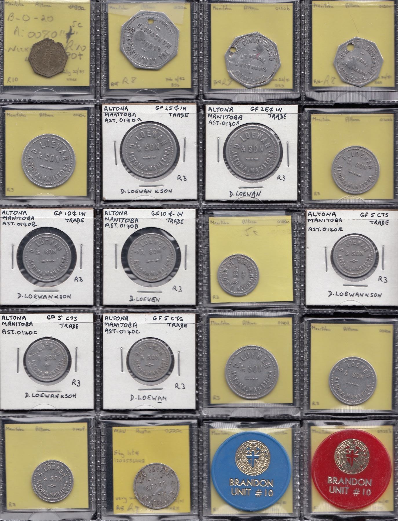 Altona, Altona Co-Op. Services Ltd. General Merchants, g/f 5c I.M., B-O-20. Fine/vf with small triangular edge nick. R10. UNLISTED, will be recorded by Mr. Astwood as 0080t; The Commonwealth 0120a, b & c (R8 - usual markings); D. Loewan & Son 0140a (3), b (3), c (4); D. Loewen & Son 0140d, e, & f; Austin, The Peoples Store 0220c - this 25c denominated token is listed as an R9, however it is bent and has a large gouge on reverse; Brandon, ANAF, 0355a & b (plastic drink tokens); 2 plastic parking tokens, 0375a & b; Cecil Hotel, 0400a; Horner’s, 0540b, c & e (all 3 R8-9); Treherne’s Nickel Arcade 0780e (R8). Brunkild, A. Svendsen, 0800a. VF-EF. 28 Pcs.
