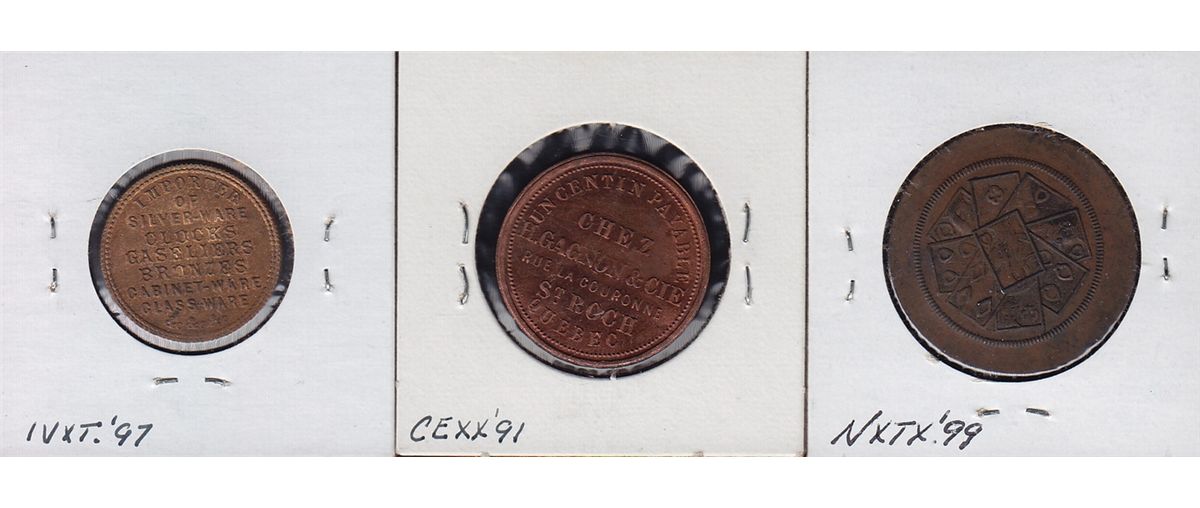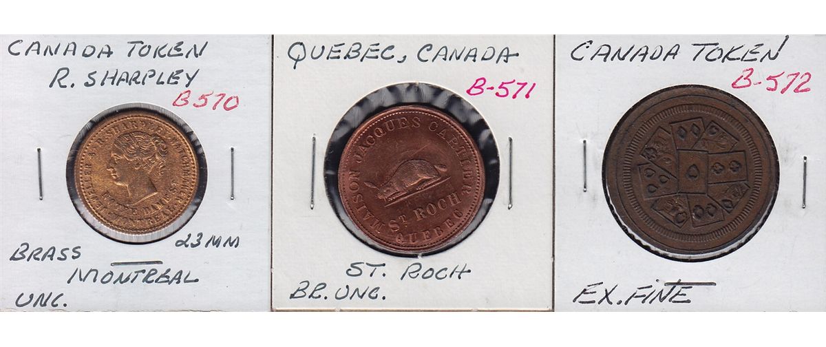 Lot of 3 Breton Tokens. Includes: BR 570, R. Sharpley, Montreal, brass, UNC; BR 571, H. Gagnon & Cie, St. Roch, PQ, copper, UNC; BR 572, cards in circle, Montreal, PQ, copper, EF. 3 Pcs.