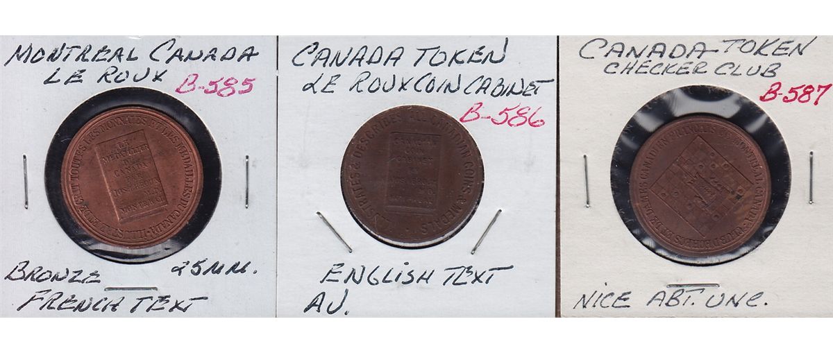 Lot of 3 Breton Tokens. Includes: BR 585, Joseph Leroux, Montreal, PQ, copper, UNC; BR 586, Joseph Leroux, Montreal, PQ, copper, AU; BR 587, Joseph Leroux, Montreal, PQ, copper, UNC. 3 Pcs.