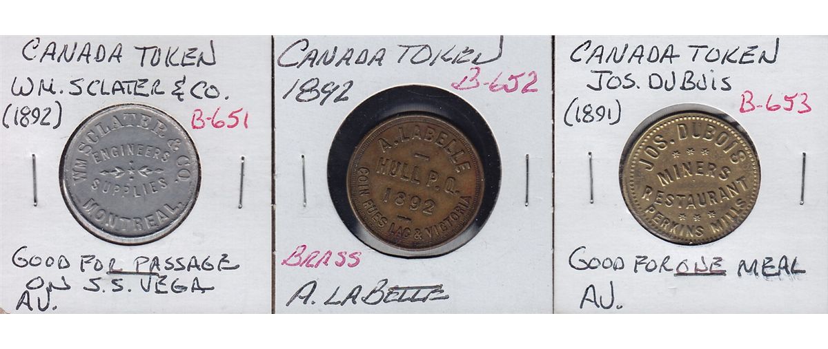 Lot of 3 Breton Tokens. Includes: BR 651, W.M. Sclater, Montreal, PQ, Aluminum, AU; BR 652, A. Labelle, Hull, PQ, brass, EF; BR 653, Jos. Dubois, Perkins Mills, PQ, brass, AU. 3 Pcs.