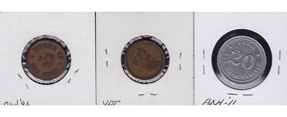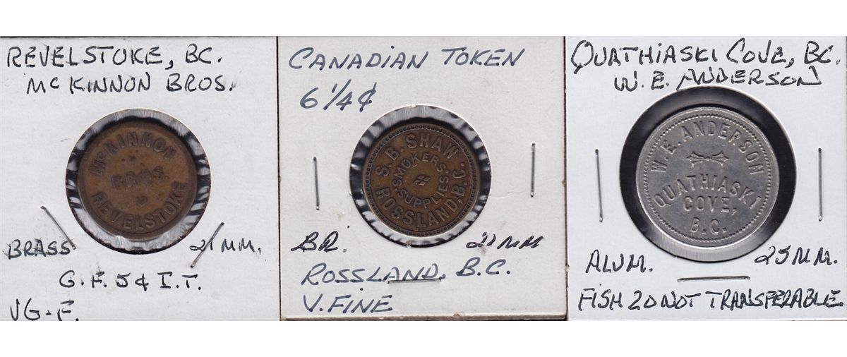 Lot of 3 British Columbia Trade Tokens. Includes: Quathiaski Cove, BC, W.E. Anderson, 20, AU, aluminum, Revelstoke, BC, McKinnon, brass, 5 cents, VG, Rossland, BC, S.B. Shaw, 6 1/4 cents, brass, VF. 3 Pcs.