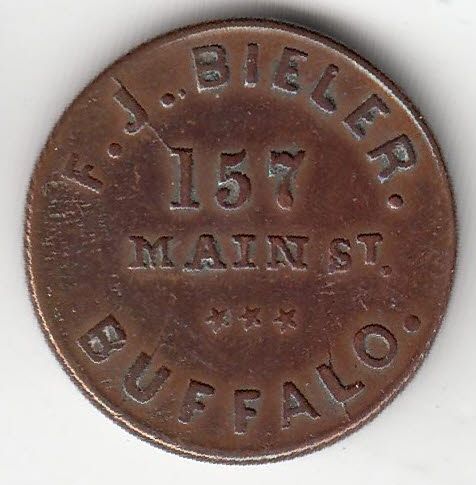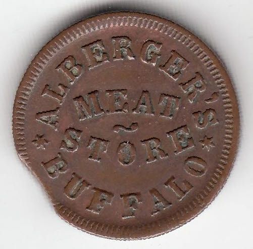 Lot of 3 Buffalo, NY Civil War Tokens. Includes 105B-1a Alberger's Meat Store, R3, Clipped Flan, nice EF. 105D-1a, F.J. Bieler, R3, VF, old cleaning. 105G-1a, E.G. Barrows, R3, nice EF. 3 Pcs.