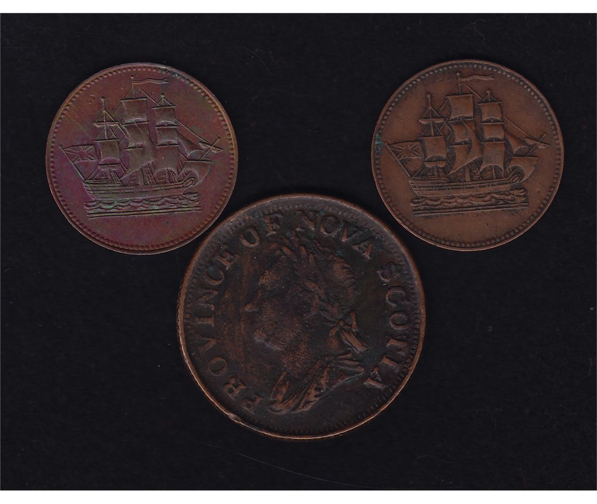 Lot of 3 Colonial Tokens - Includes: 2 Ships & Colonies and 1 1832 Province of Nova Scotia One Penny Token. 2 Pcs.