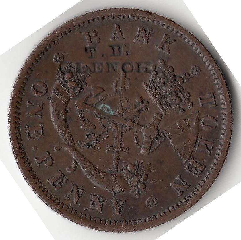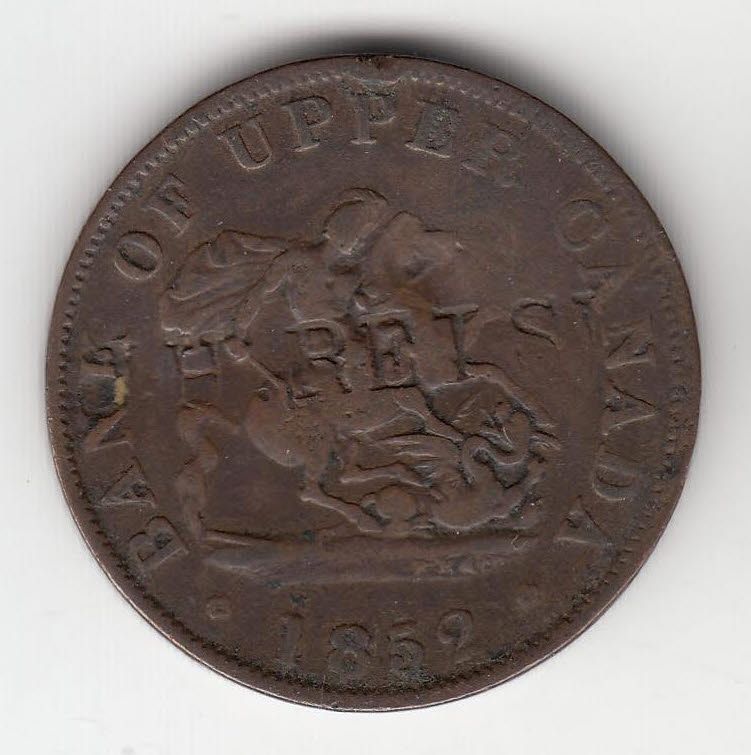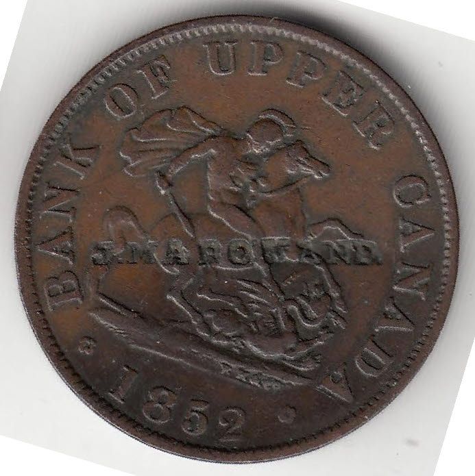Lot of 3 Countermarked Canadian tokens. Includes: Brunk #C-583 T.B. / Clench (2mm x 6mm and 2mm x 14mm) countermarked on a BR 719 1854 Bank of Upper Canada One Penny, Brunk does not list this countermark type on a Canadian token, Freeman S. Clench moved to Cobourg, UC in 1825. In 1848 his sons Thomas and William, joined the business, which became one of the finest Canadian cabinet makers. In 1871 Thomas died when he fell from a railroad viaduct. William continued operations until 1888. Brunk #R-188 J.H. Reish (3mm x 25mm) countermarked on reverse and obverse of a BR 720 1852 Bank of Upper Canada Half Penny. J. Marquand (1.25mm x 18mm) countermarked on a BR 720 1852 Bank of Upper Canada Half Penny. Countermarks F to VF. 3 Pcs.