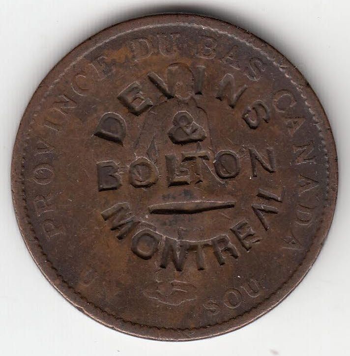 Lot of 3 Devins & Bolton Countermarked Canadian Tokens. Includes: D&B (Sm3) countermark on the obverse of Br522 1837 Un Sou Quebec Bank on ribbon. D&B (Sm2) countermark on the obverse of Br529 1852 Un Sou Quebec Bank token. D&B (Sm1) countermark on the obverse of Br919 1857 Self Government and Free Trade. Countermarks VF. 3 Pcs.