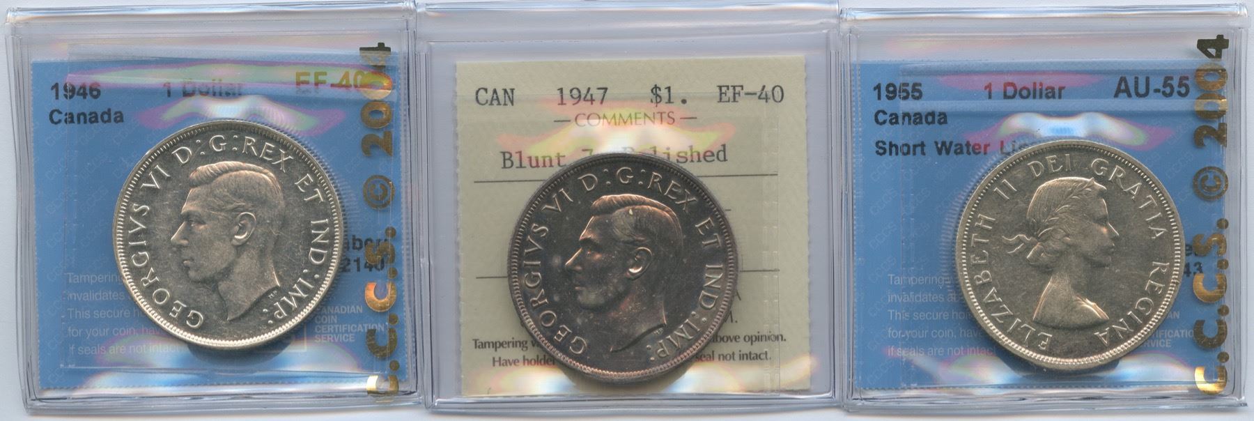 Includes: 1946 CCCS EF-40. 1947 ICCS EF-40, blunt 7, polished. 1955 CCCS AU-55, SWL. 3 pcs.