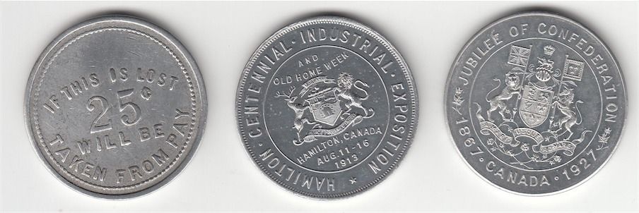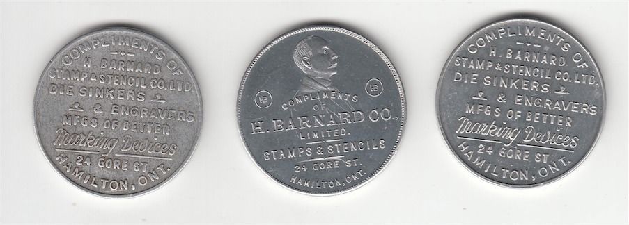Lot of 3 H. Barnard Advertising Medals. Includes: Rev: If This Is Lost 25c Will Be Taken From Pay. Alum, 35mm, VF, Ex Palmer. Rev: Hamilton Centennial 1913. Alum, 35mm, Unc, Ex Palmer. Rev: Jubilee of Confederation 1927. Alum, 35mm, EF. 3 Pcs.
