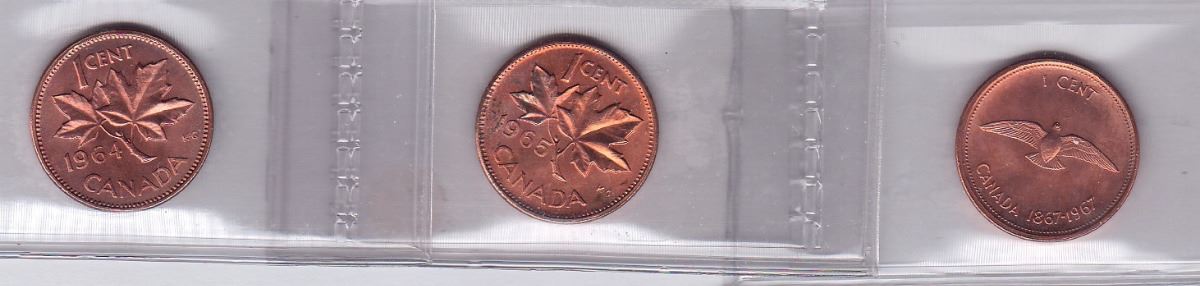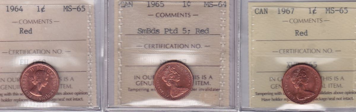 Includes: 1964 MS-65, red. 1965 MS-64, small beads, pointed 5, red. 1967 MS-65, red. 3 Pcs.