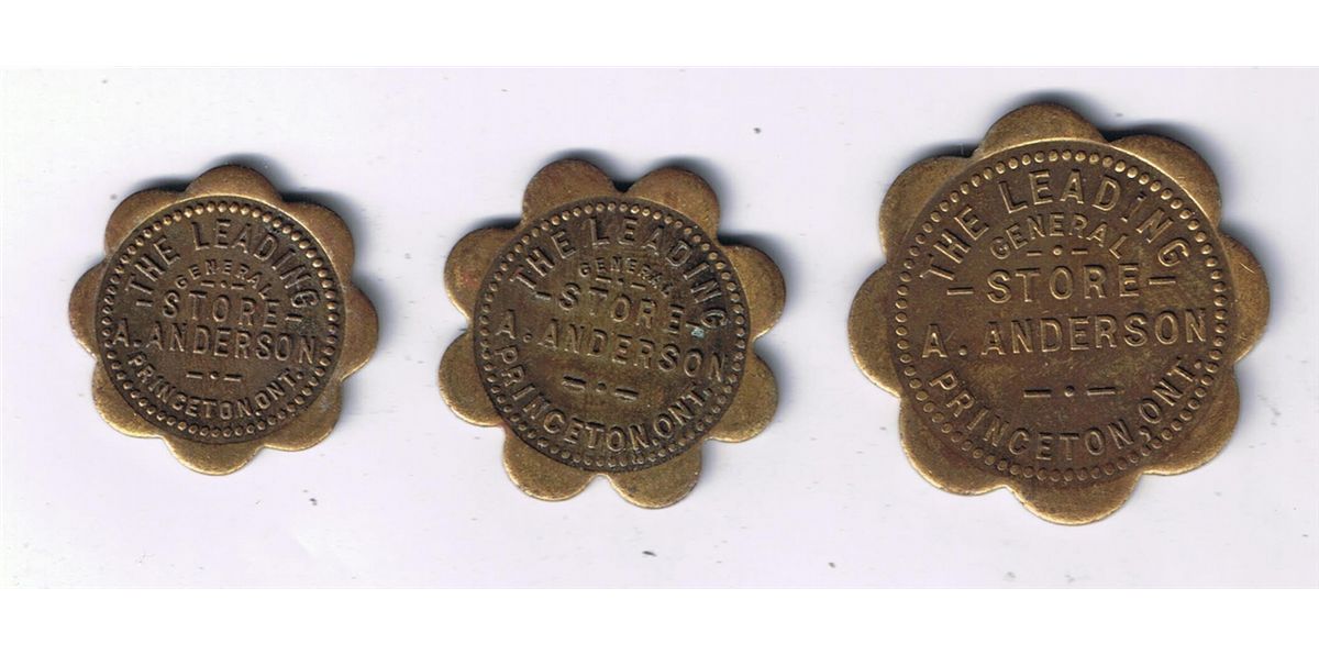 Lot of 3 Mc 398. The Leading General Store A. Anderson. Good for 1, 5 and 10 in merchandise. Brass, scollop. McColl claims 5 struck. EF. 3 Pcs.